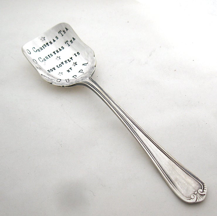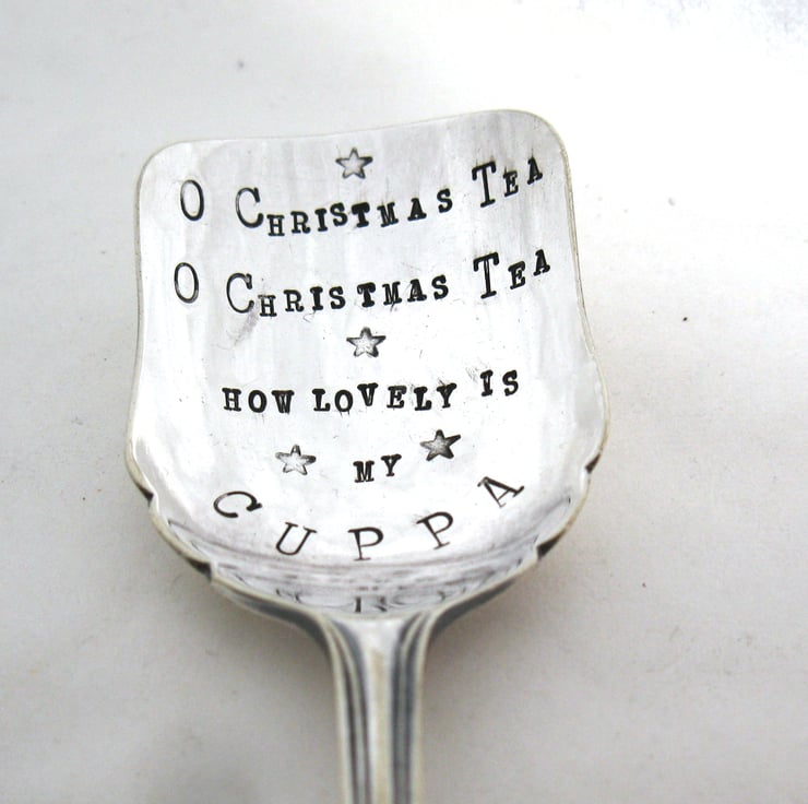 A hand stamped vintage silverplated tea caddy spoon with a scroll detail on the handle and the words 'O Christmas Tea, O Christmas Tea, How Lovely Is My Cuppa' in the bowl. A lovely little Xmas gift for a tea-drinker, perhaps along with a nice tin of loose tea.