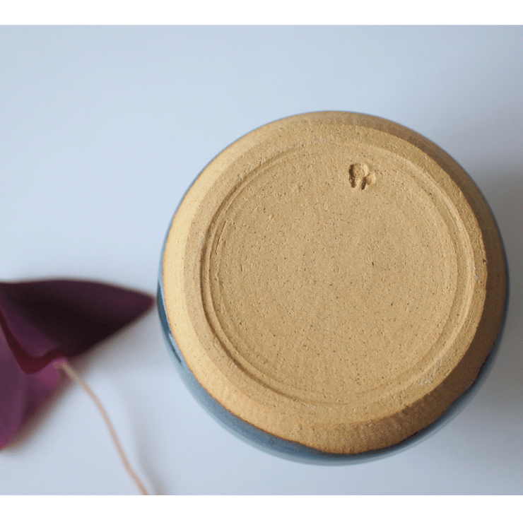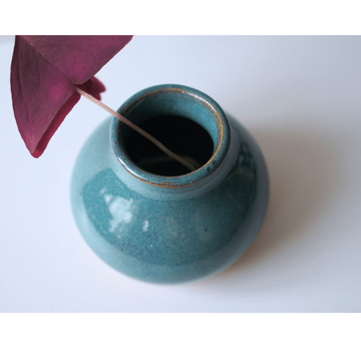 A little stoneware bud vase glazed in blue colours. Round and cute, smoothly curved.