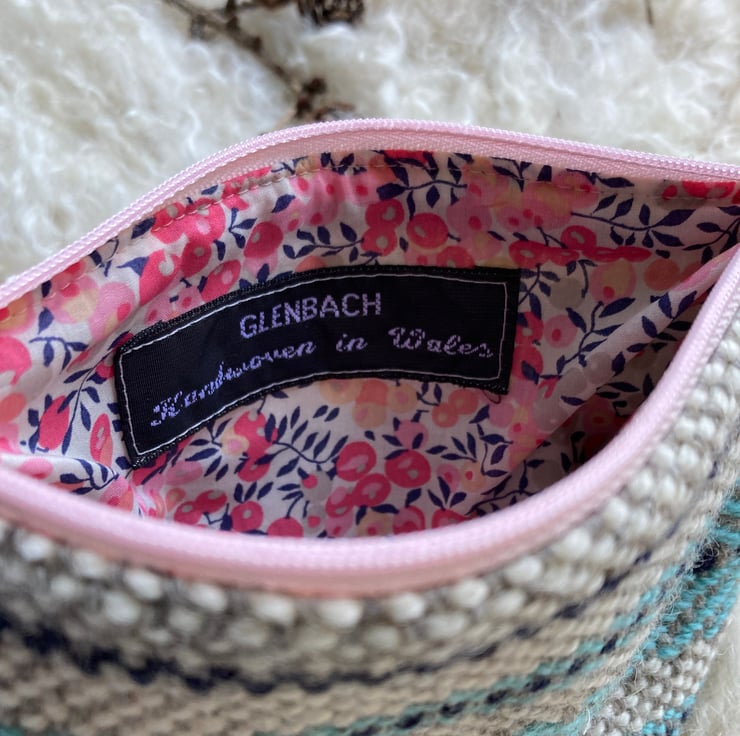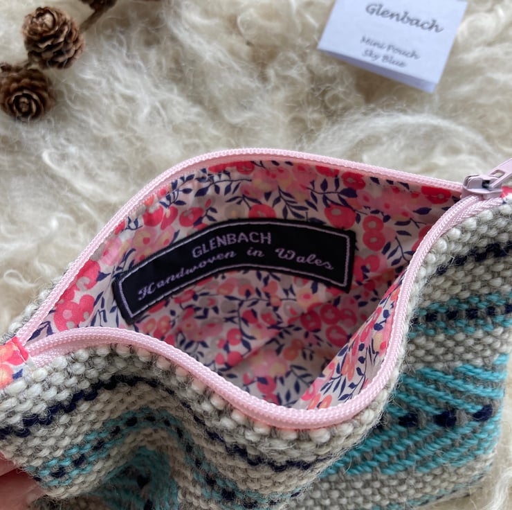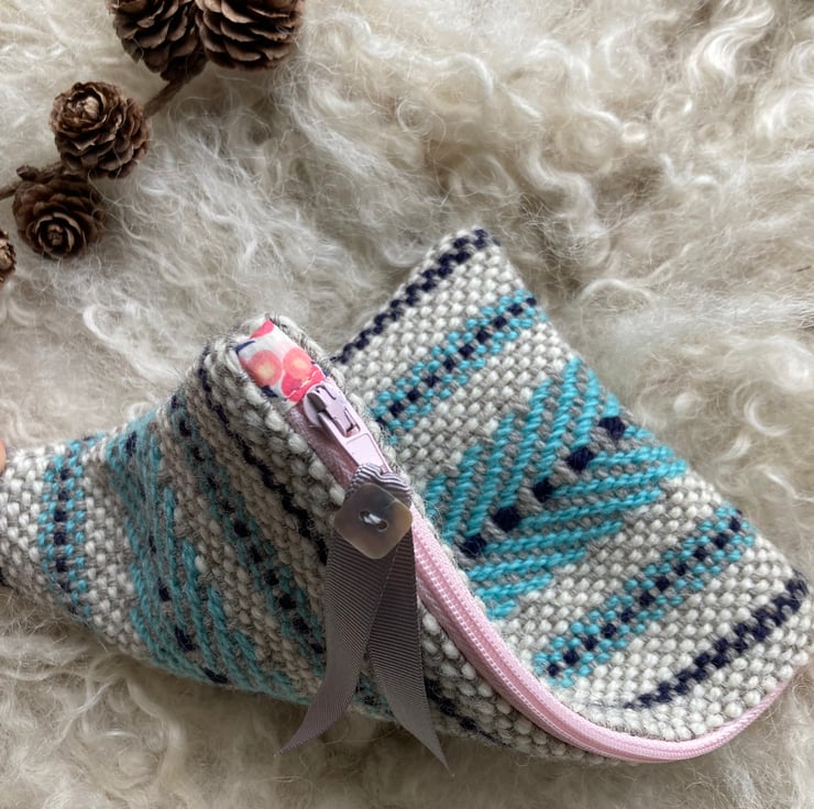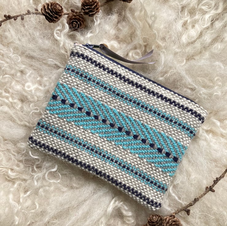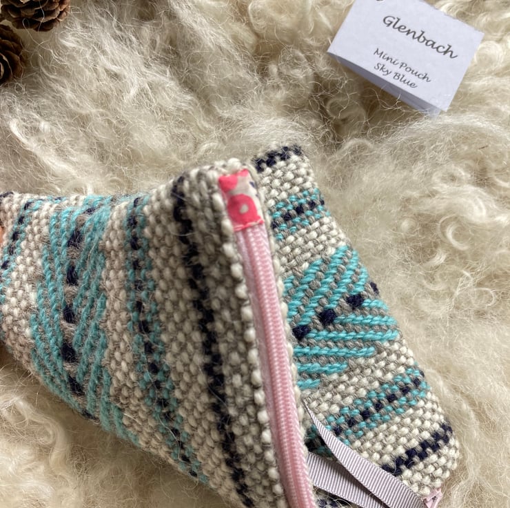Our Mini pouch is handwoven using natural shades of grey and ecru wool with a contrast of sky blue and navy - all British wool.