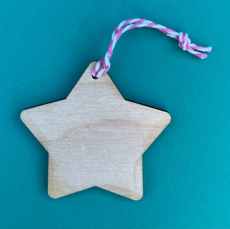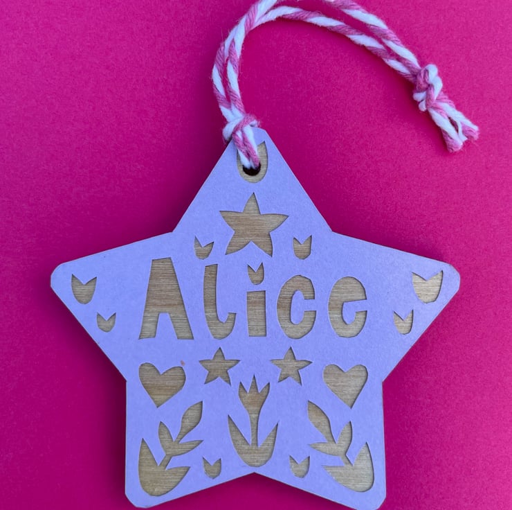 I draw each design by hand, adding your loved one’s name, and carefully cut the design into coloured paper. I then apply the papercut to a wooden shape and varnish it to keep it safe. The decoration is finished with a pink and white striped string. The star is 7.5cm in width and length.
