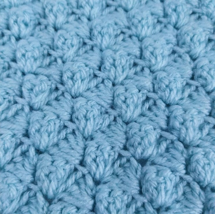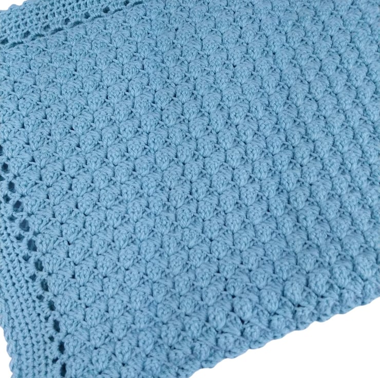 This handmade crochet baby blanket is lovingly made in a soft duck egg blue, perfect for keeping your little one cosy and comfortable.