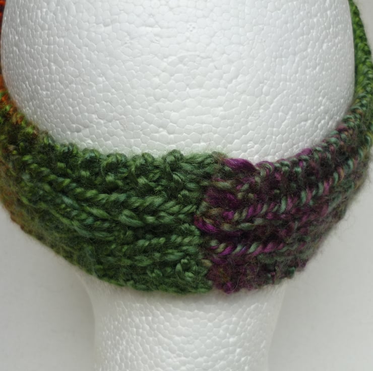 This has been knitted 'flat' and joined by a neat seam at the back. The width is graded from 5in (12.70cm) at the widest point (front) to 1.75in (4.50cm) at the back. Total (unstretched) length is 19in (48.25cm).... quite stretchy, fits most.