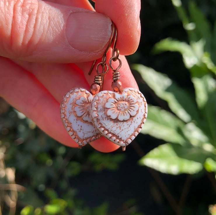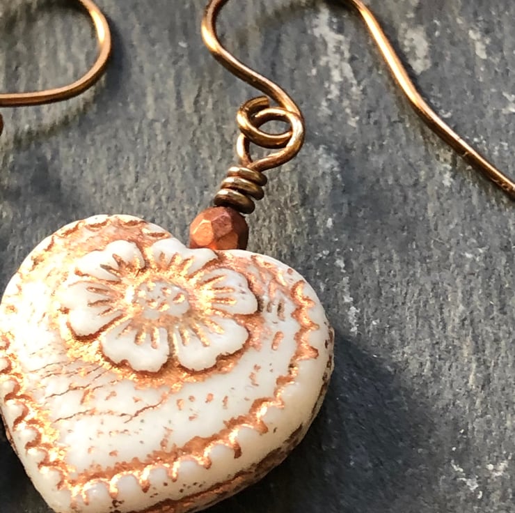 The earrings feature opaque white Czech glass heart beads with a copper flower motif and small copper Czech glass fire polished beads.