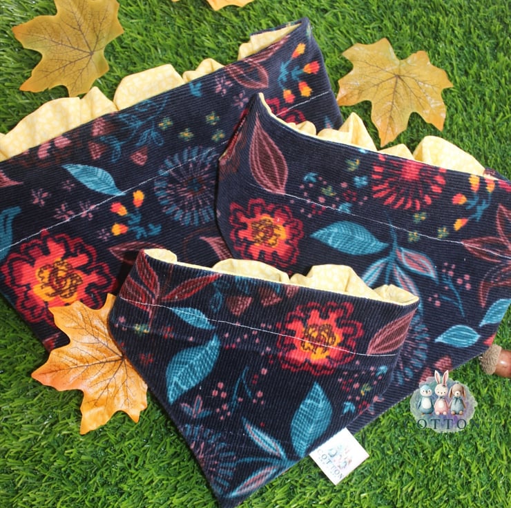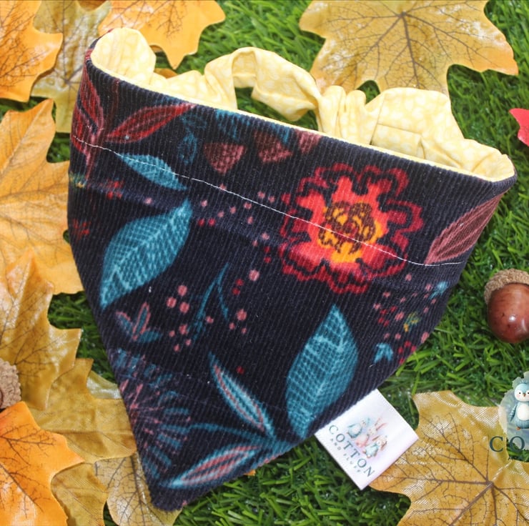 These gorgeous bandanas have a real autumnal feel to them. One side is a soft patterned corduroy and the other is a pretty yellow cotton fabric.This listing is for a scrunchie back bandana. Perfect to slip over the dogs head without the need for a collar.