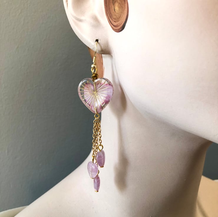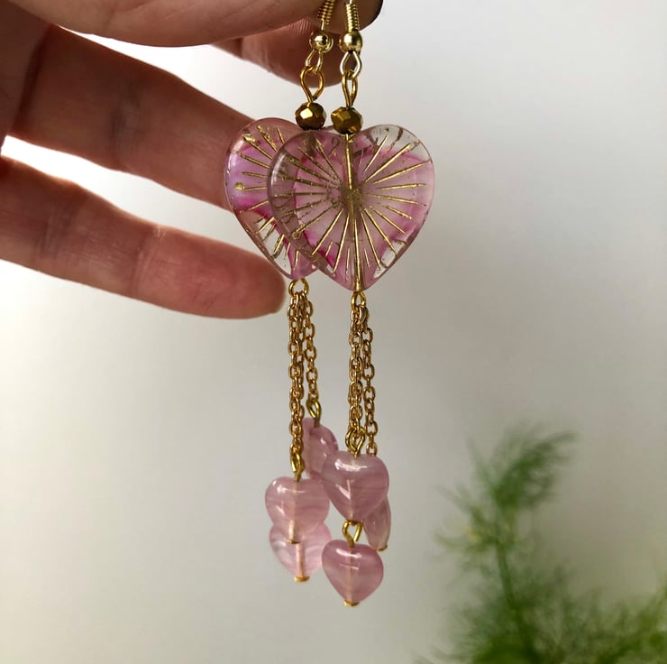 Long dramatic dangly pink heart earrings handmade with love & care in my small studio in Colchester, Essex.