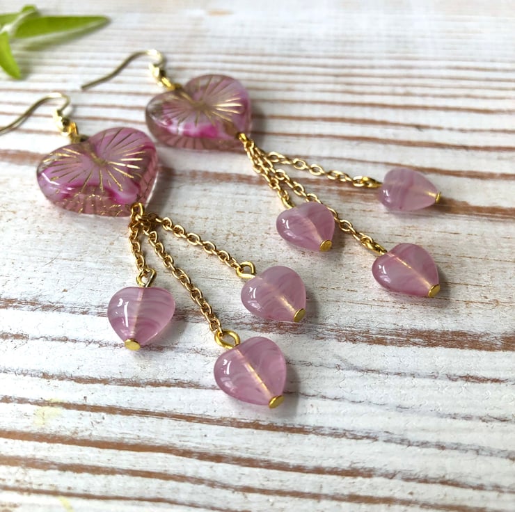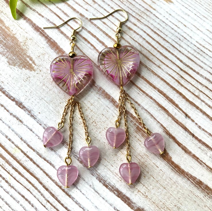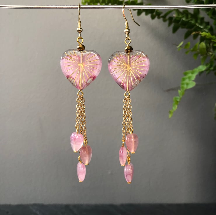 The earrings feature pink Czech glass sacred hearts and lengths of hand-cut gold plated chain with smaller Czech glass heart beads. The earrings are finished with gold plated hooks.