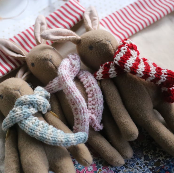 Each patchwork pocket contains a little bunny made from wool/cashmere fabric with a hand knitted stripe scarf in Rowan yarn.