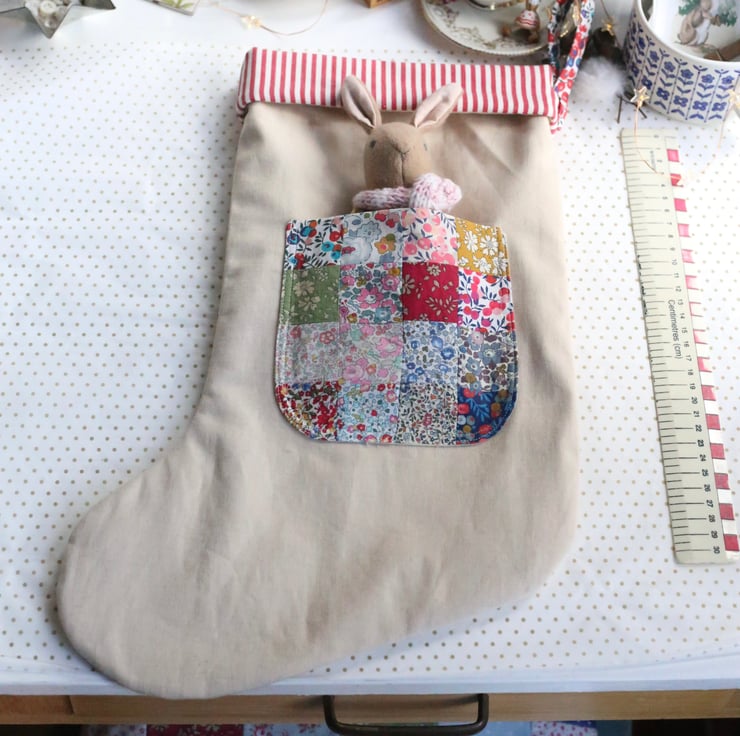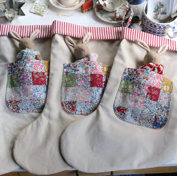 There will be 4 stockings for boys and 2 for girls, each made with a patchwork pocket comprising of 16 beautiful Liberty of London prints.