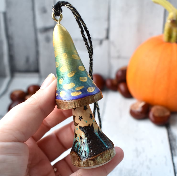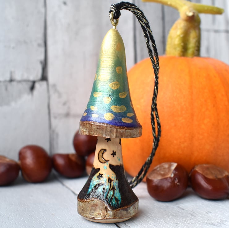 An unusual wood burned mushroom decoration for the home! This one has a fox design, with stars and crescent moon. Decorated with metalic paint, and art pencils.