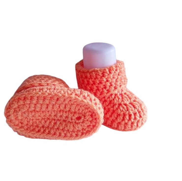 These cheerful crochet baby booties are perfect for keeping tiny toes warm and cosy. Handcrafted in a soft clementine orange yarn, they make a lovely unisex gift for any new baby. The simple slip-on design means no fiddly fastenings, just gentle comfort and warmth for little feet.