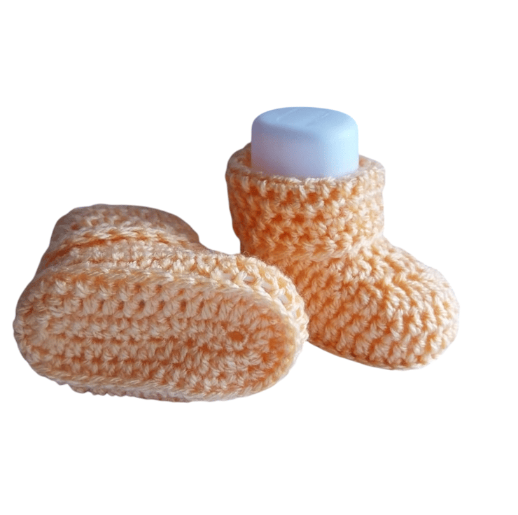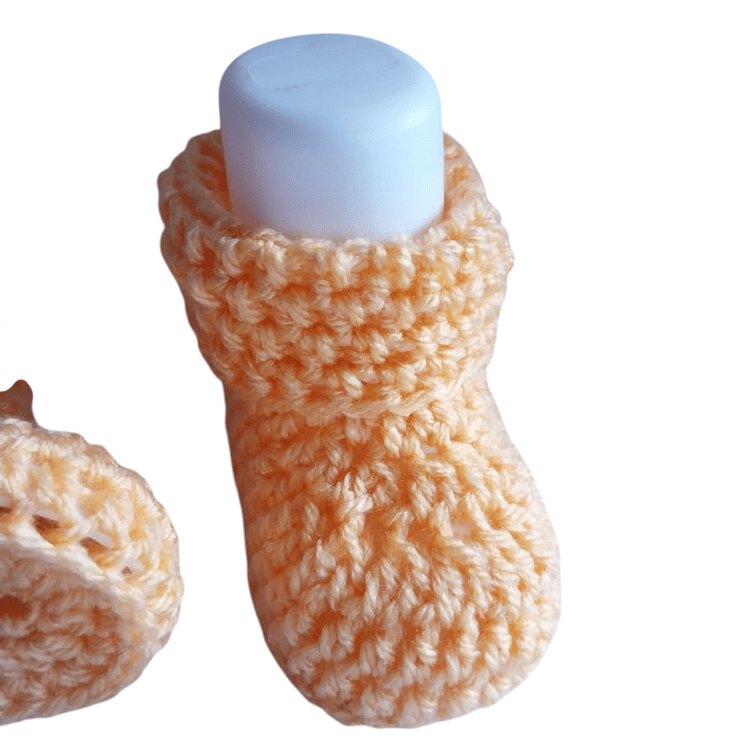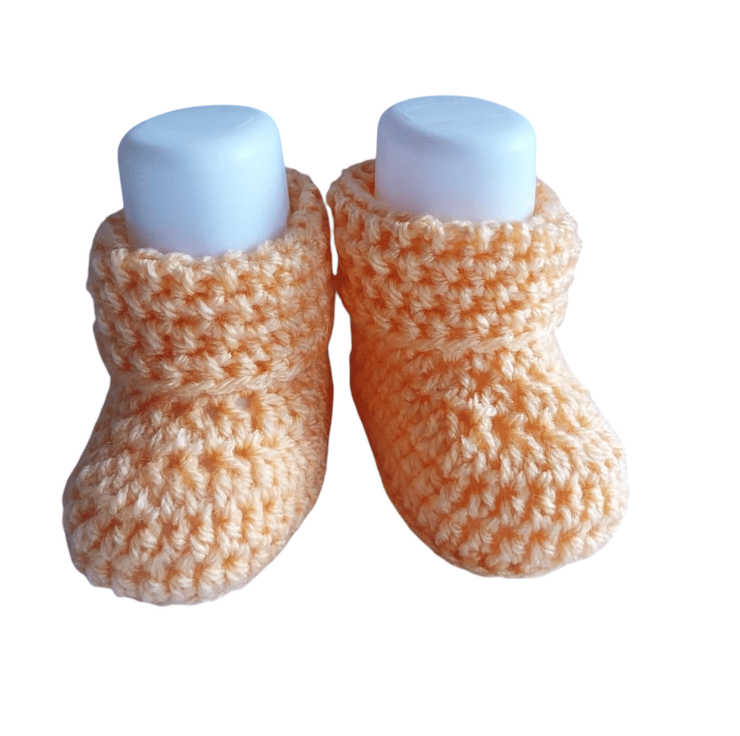 Keep your little one’s toes toasty with these super cute light saffron orange crocheted baby booties! Lovingly handmade, they’re perfect for babies aged 0-3 months. With a soft, snug fit, they guarantee comfort, while the charming design adds a sweet touch to any outfit.