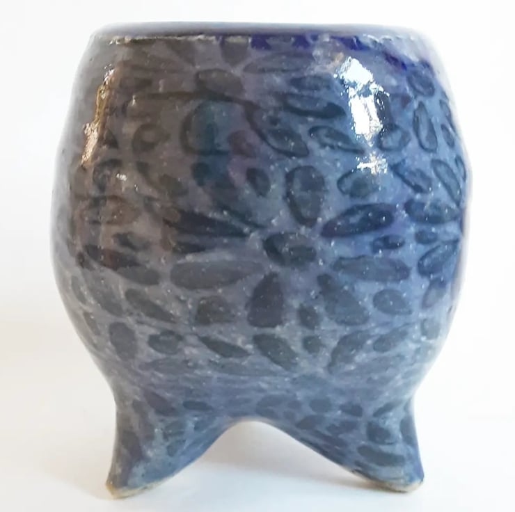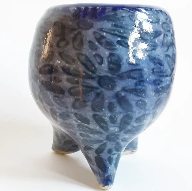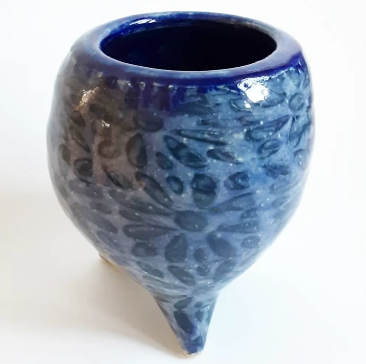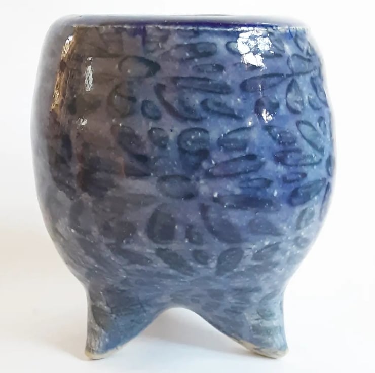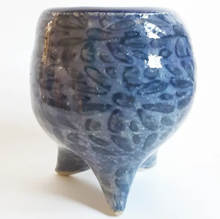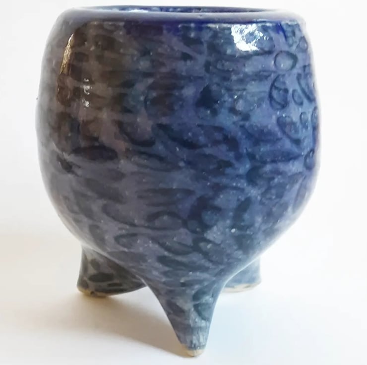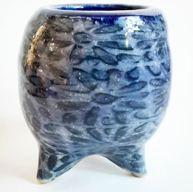 Glazed in a blue glaze with a pattern on the outside.