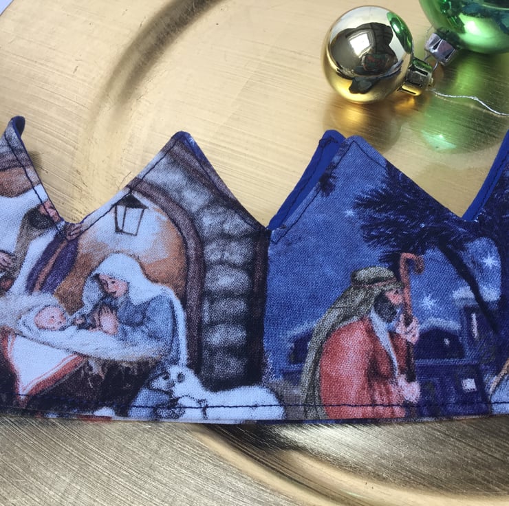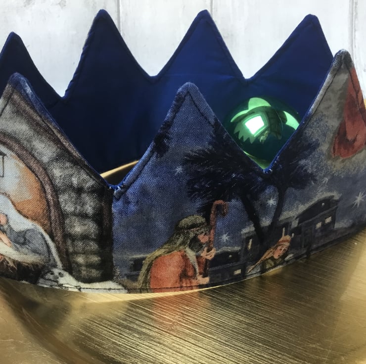 These crowns will last for years and will look so much nicer than the thin, tissue paper ones. Choose designs to suit your guests. This one is made from a remnant of blue fabric that shows a nativity scene and is joined with blue elastic. It is listed as a ‘second’ because, in using up small pieces of fabric, there is seam where our crowns don’t usually have seams. This is shown in the photos. In no way does this affect the function and it has been made with the same care as any of our other products. This is an ideal way to be sustainable on a tight budget.
