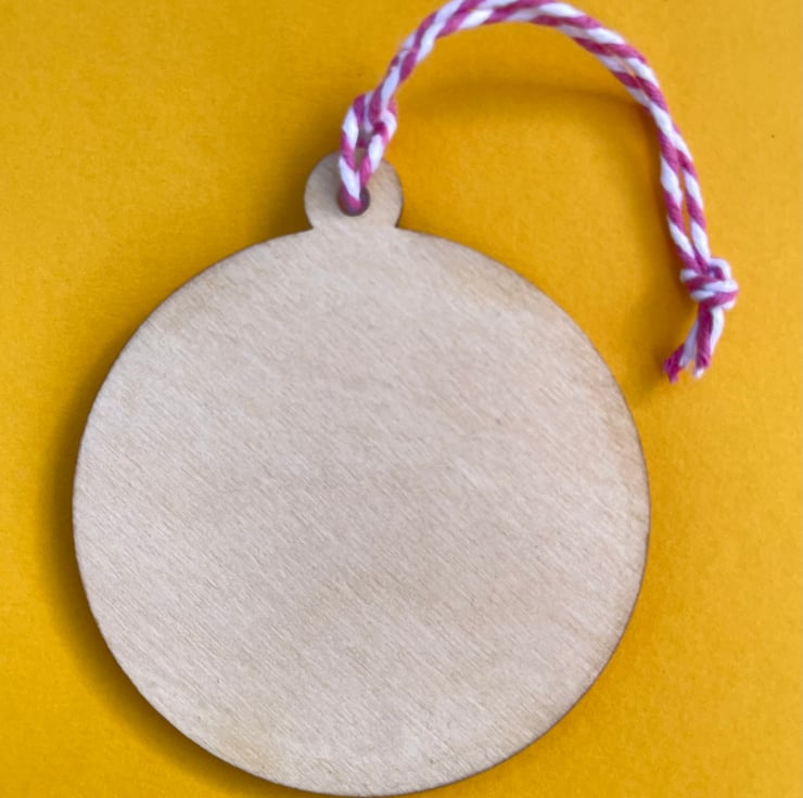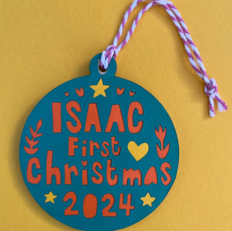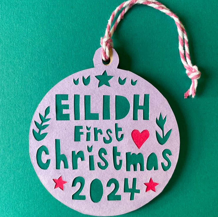 I draw each design by hand, adding the baby’s name, and carefully cut the design into coloured paper. I then apply the papercut to a wooden shape and varnish it to keep it safe. The decoration is finished with a pink and white striped string. The bauble shape is 7.5cm in width and length.