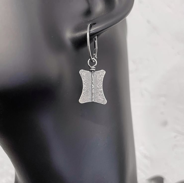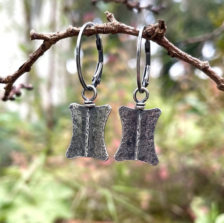 Textured with hammers and punches and hanging from wire wrapped loops, these little tag like earrings have an ethnic tribal feel.