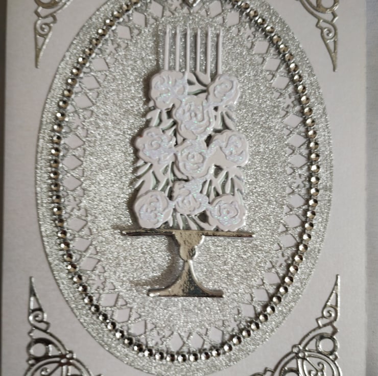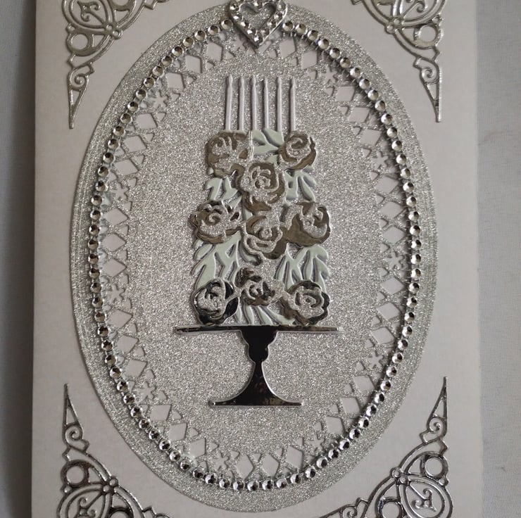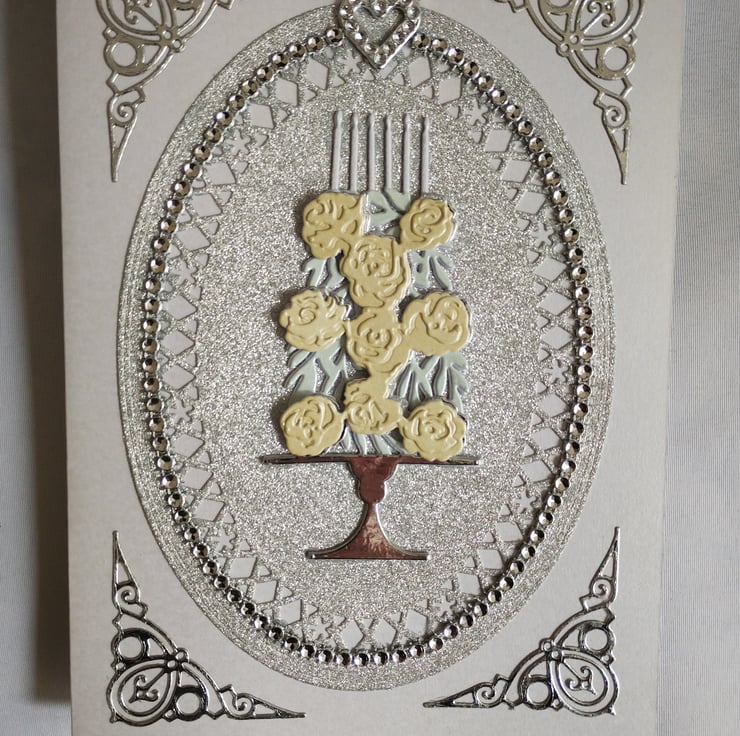 This is a beautiful book style gift box bag keepsake made with premium quality white pearl finish card and decorated with diamante style gems and heart. The featured rose cake can be made in a variety of colours and finishes the examples shown are silver, yellow, pink and white. The oval is cut from gorgeous silver non-shed glitter and the corner details are silver mirri-card. The gift box bag will come complete with paper 'bookmark' tassel and matching gift tags for you to write your message. This gift box bag would make a gift for any special occasion even more memorable.