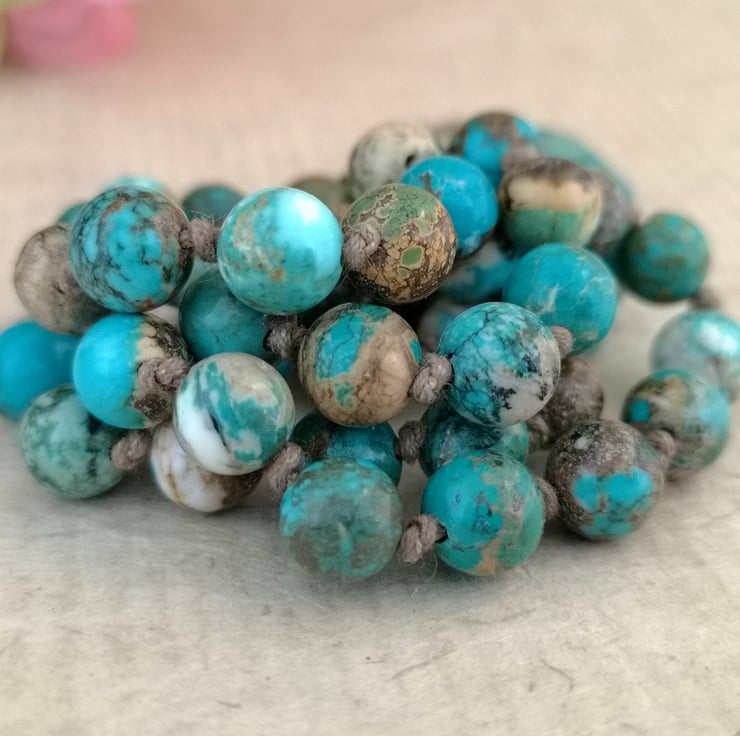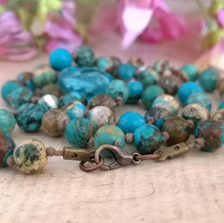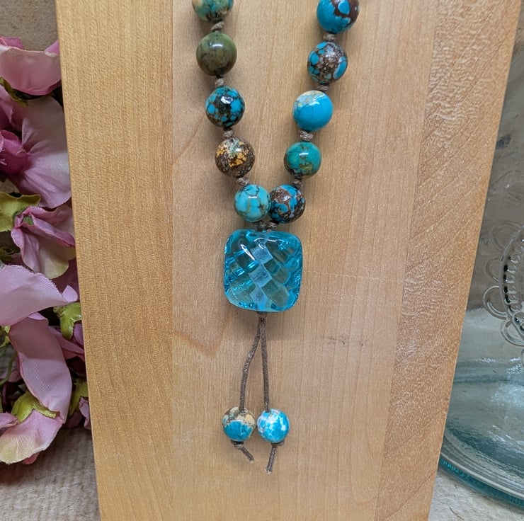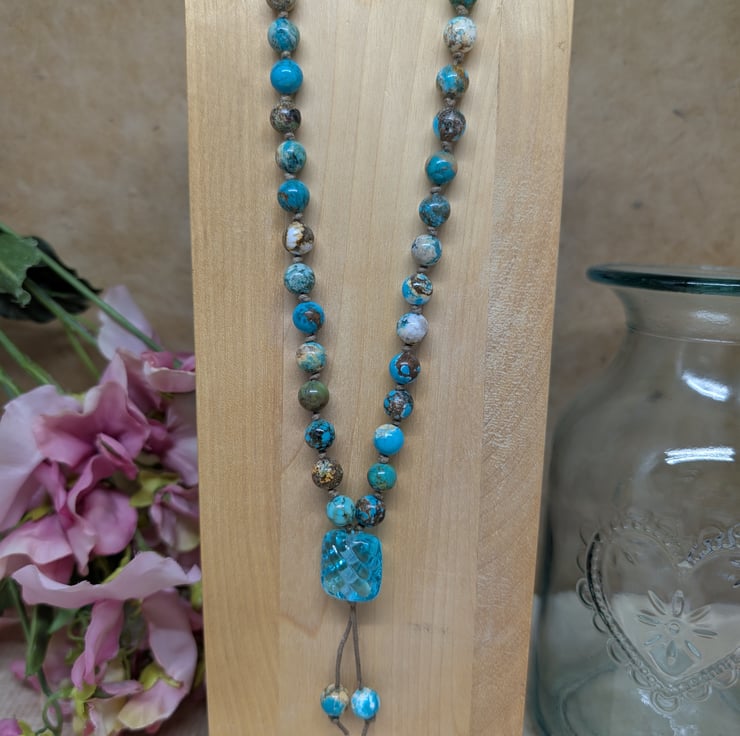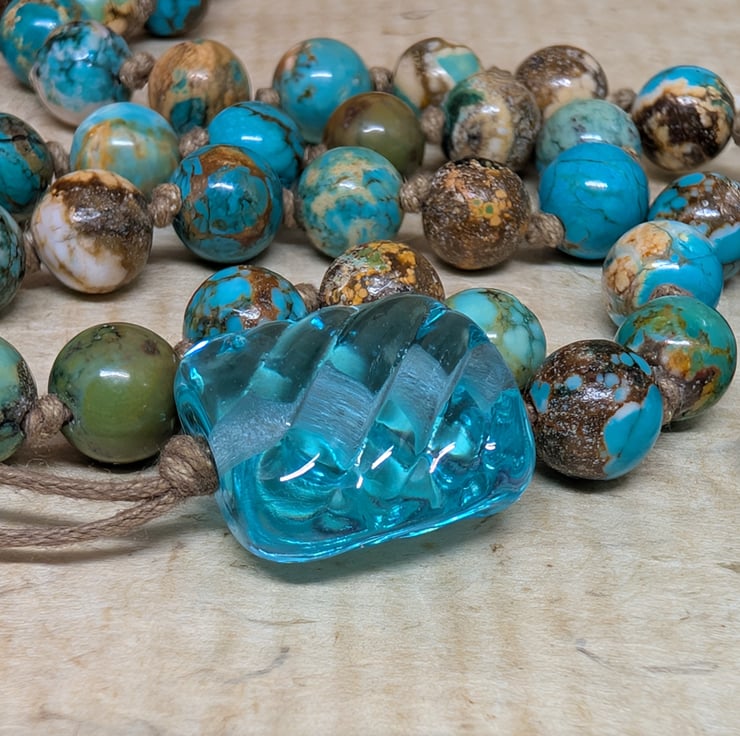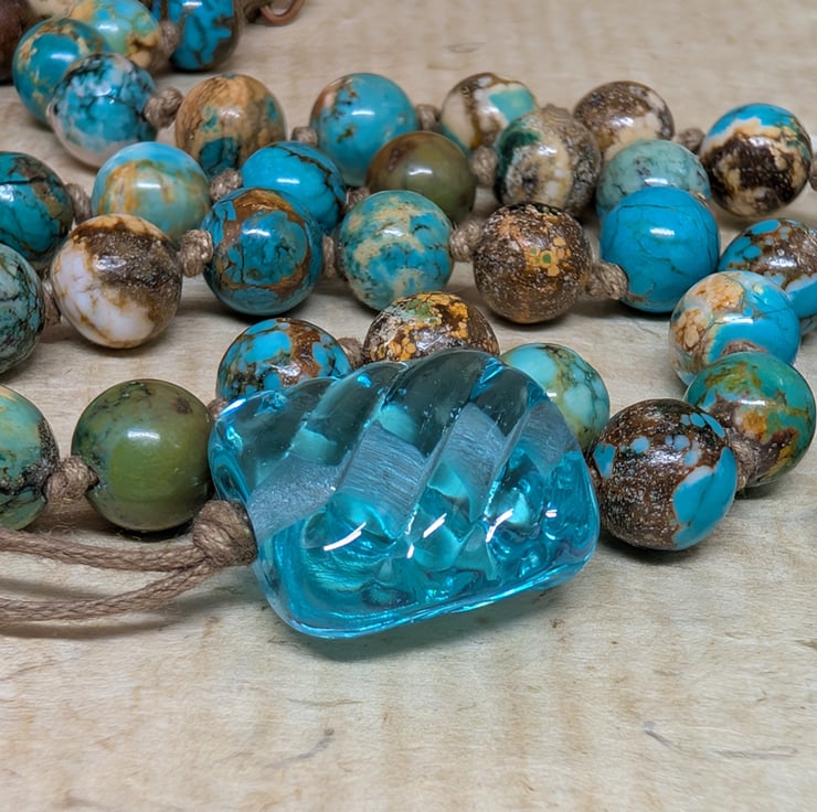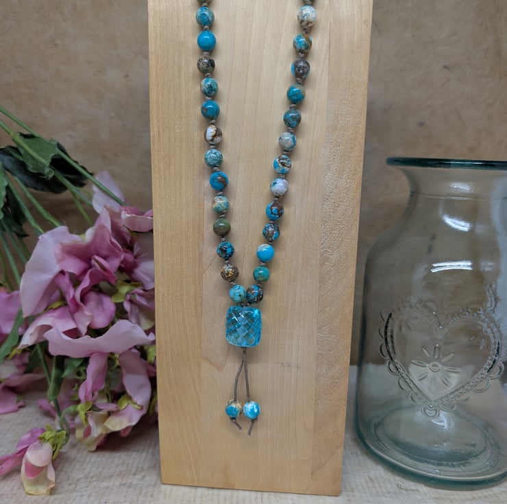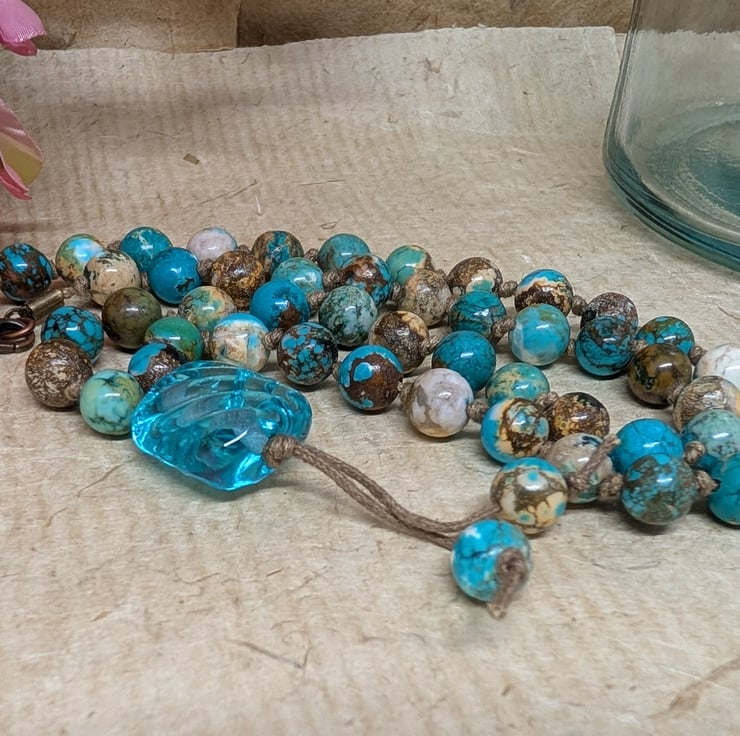 This handcrafted necklace features stunning blue-green ocean jasper semi precious beads, carefully knotted onto cotton cord for a natural and organic feel. At the centre is a handmade lampwork glass bead in a beautiful in a beautiful aquamarine blue to complement the jasper. The necklace fastens securely with a lobster clasp.