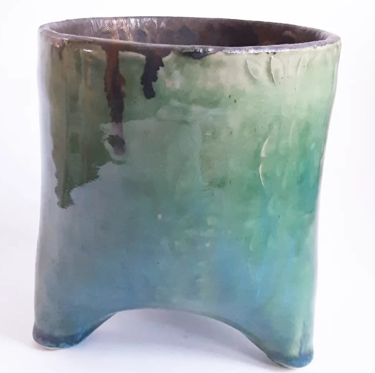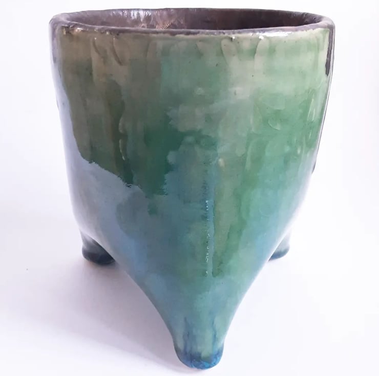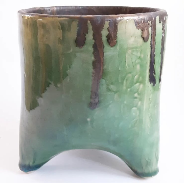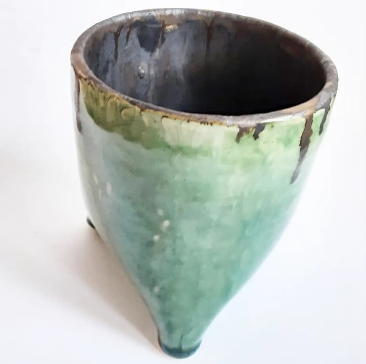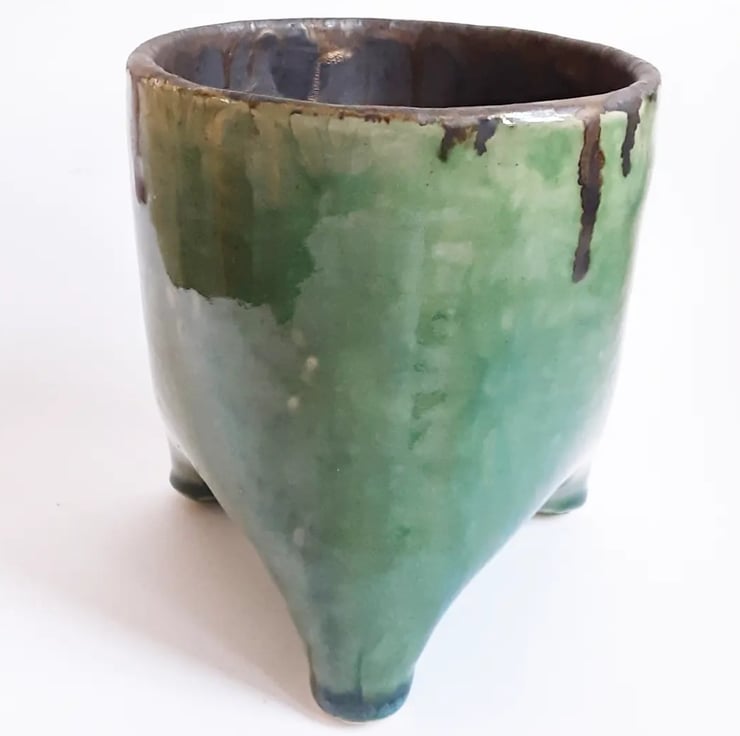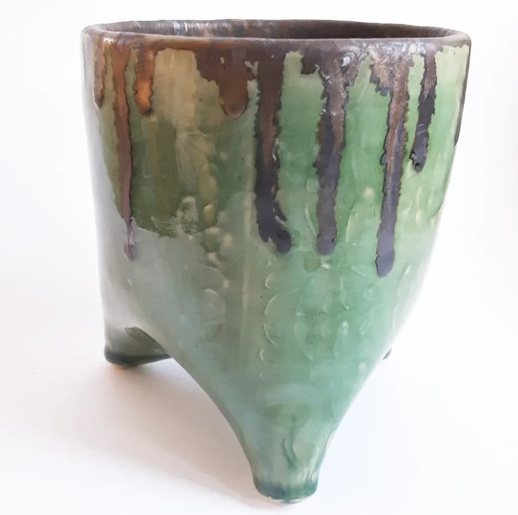 Glazed in green glaze on the outside and bronze on the inside and rim dribbling down the outside beautifully in places.