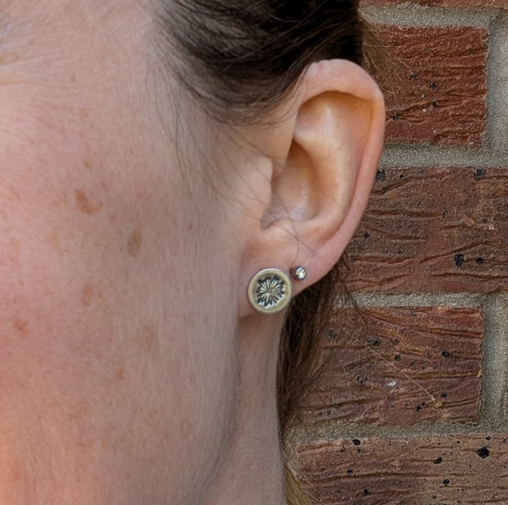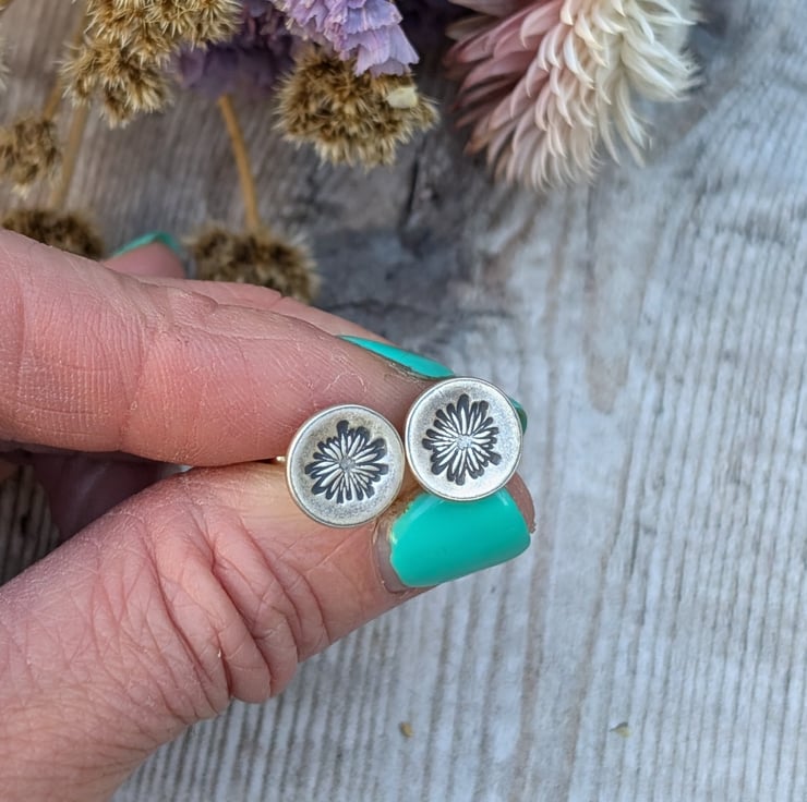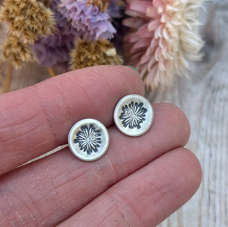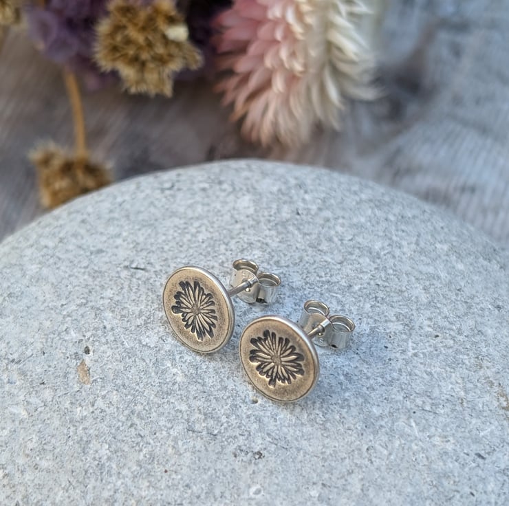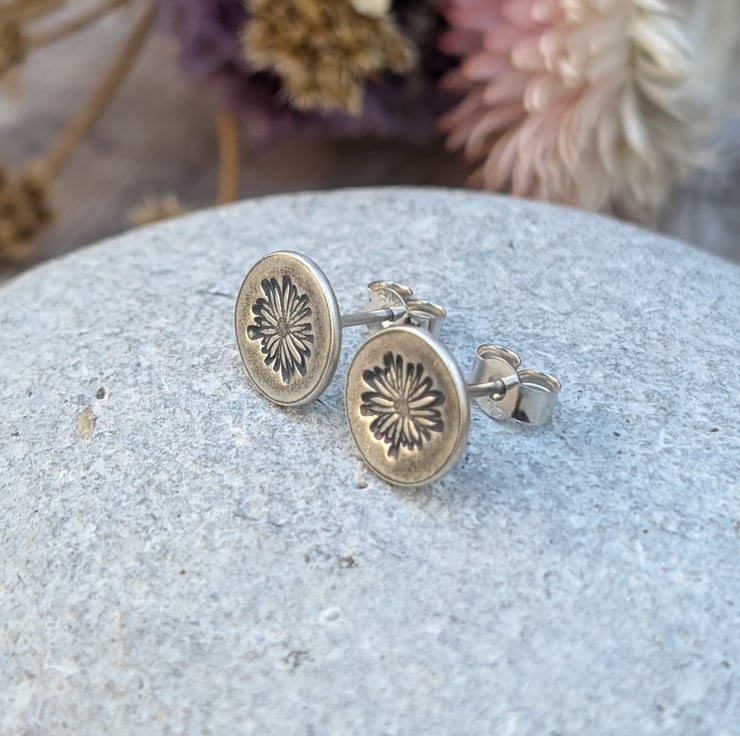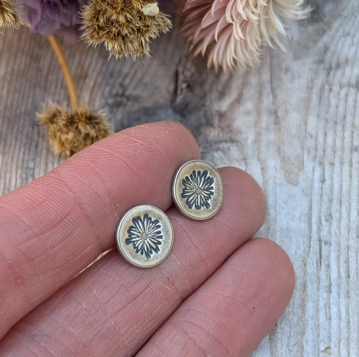 These handmade stud earrings, created from recycled silver, feature charming hand stamped daisy impressions set within small circular discs. The oxidised finish highlights the delicate floral design, bringing a sense of nature’s beauty to the forefront. Their simple, yet detailed style makes these studs versatile for everyday wear, while adding a touch of individuality to any outfit.