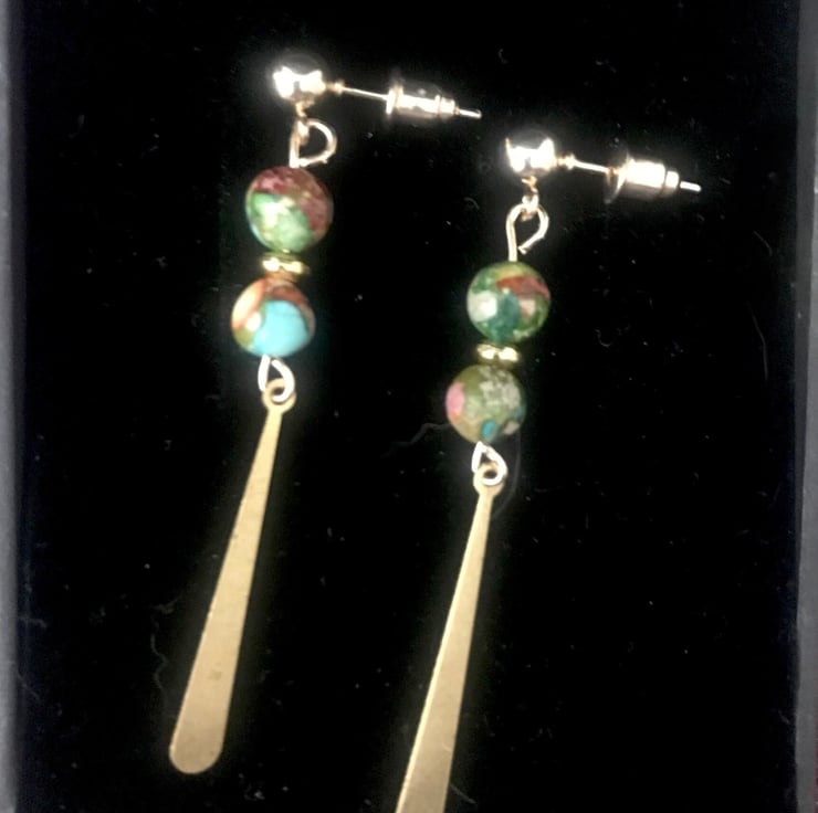 Earrings, Semi Precious Imperial Jasper - Dangle - Gold Plate - Drop is approx 2”. Imperial Jasper is the the premium jasper because of the natural vibrant colours. Imperial Jasper can is also known as emperor and fancy jasper.