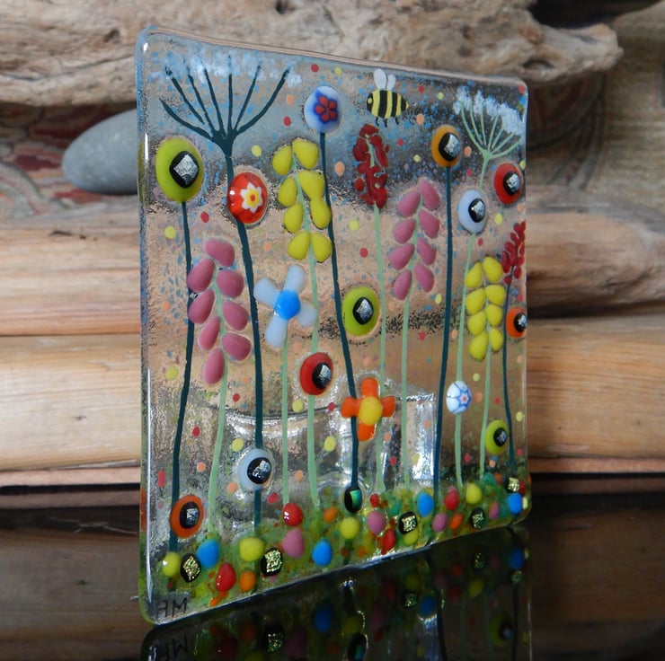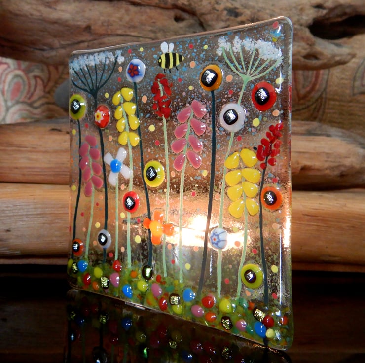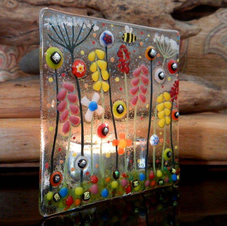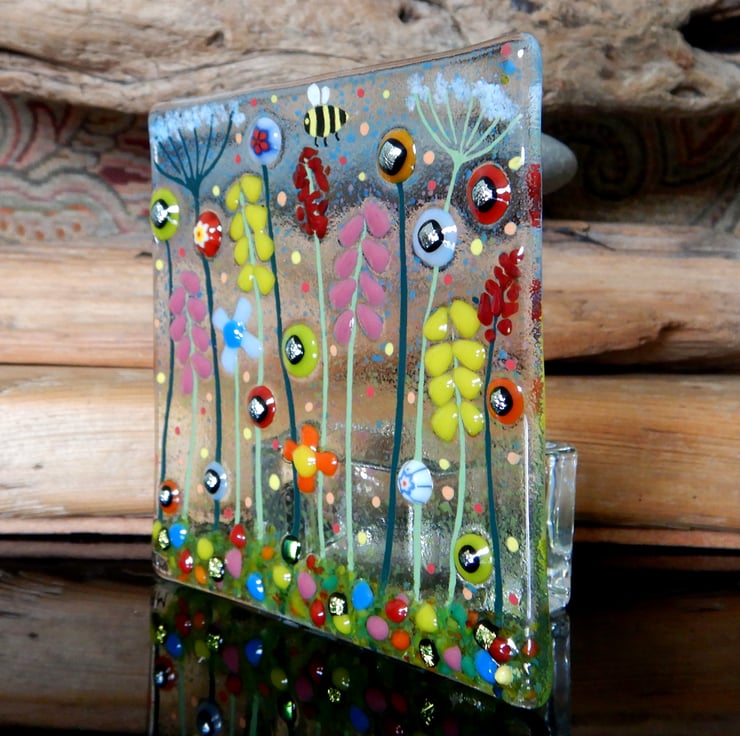 Lovely, bright, colourful, and cheerful T-light holder. Carefully made by myself using bullseye glass, dichroic glass, and frit glass. Each piece of glass was positioned carefully to make sure that the composition was balanced, and that it would have maximum visual impact.