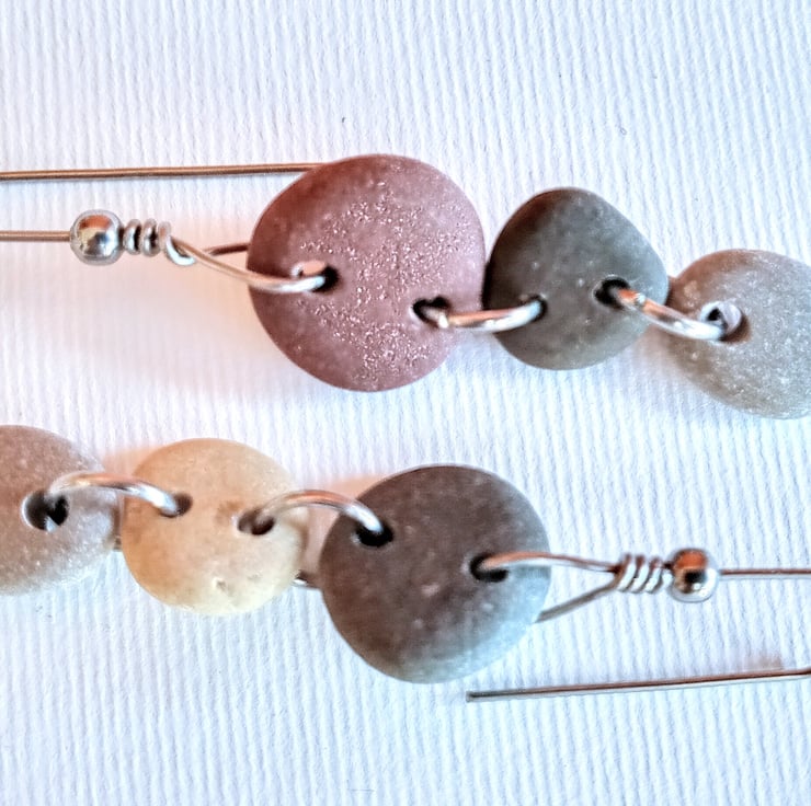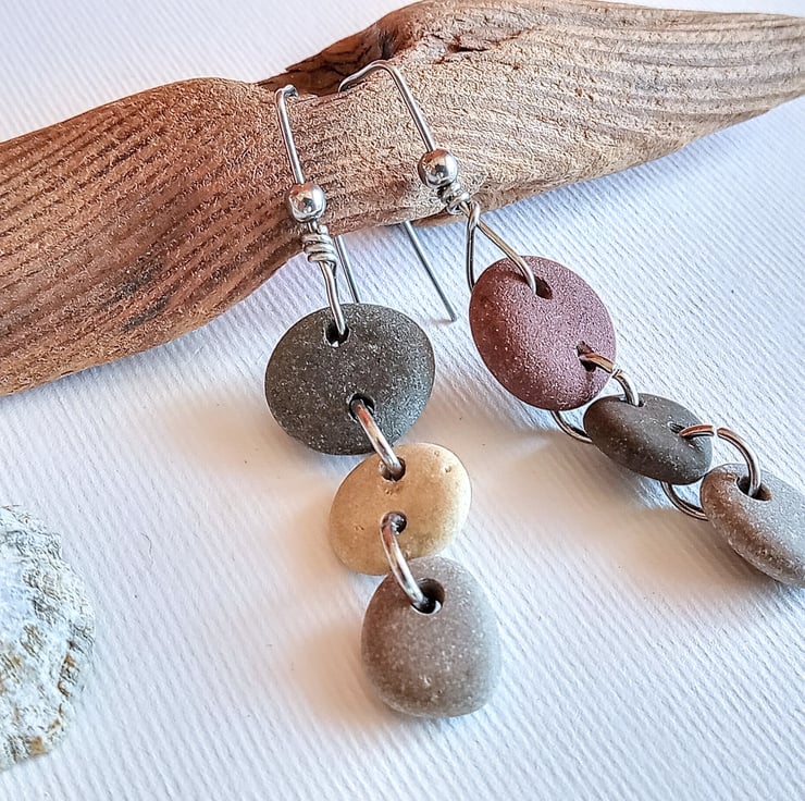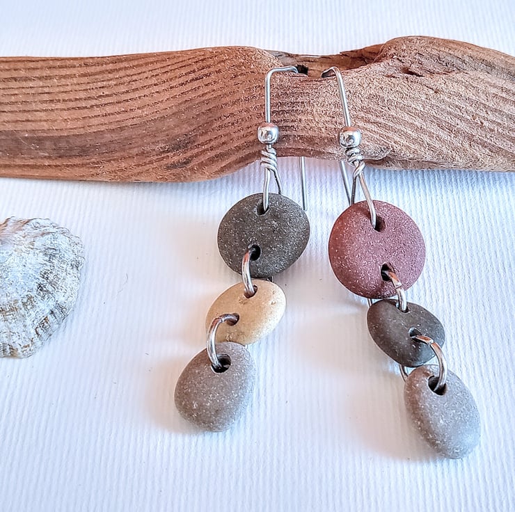 Pebble link dangle earrings, each earring created from 3 hand-drilled beach pebbles, hanging from handmade stainless steel earwires.
