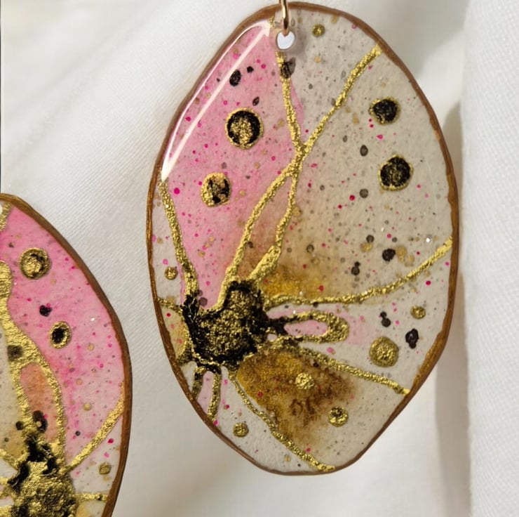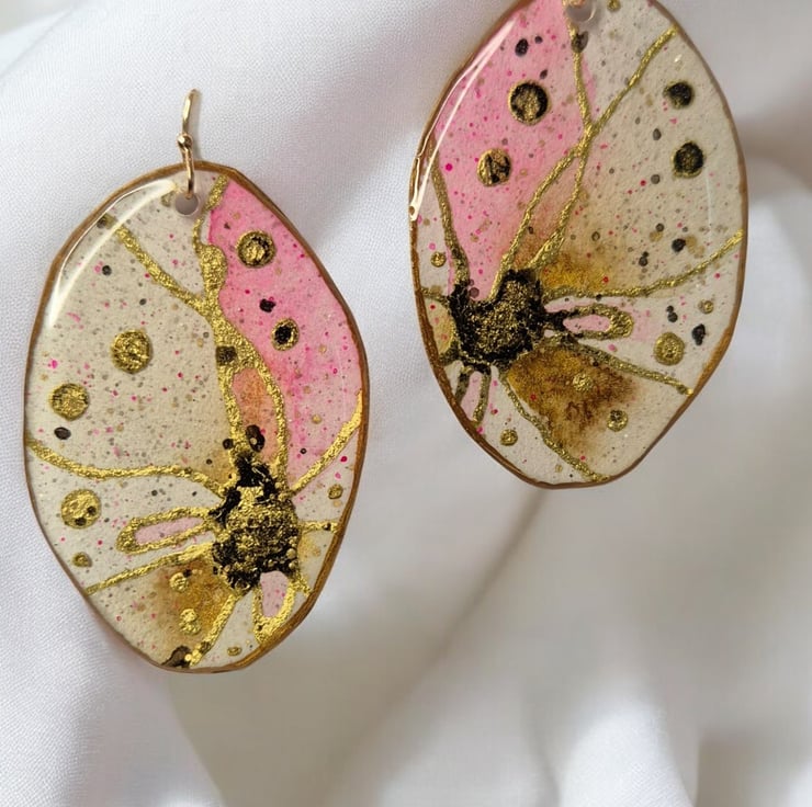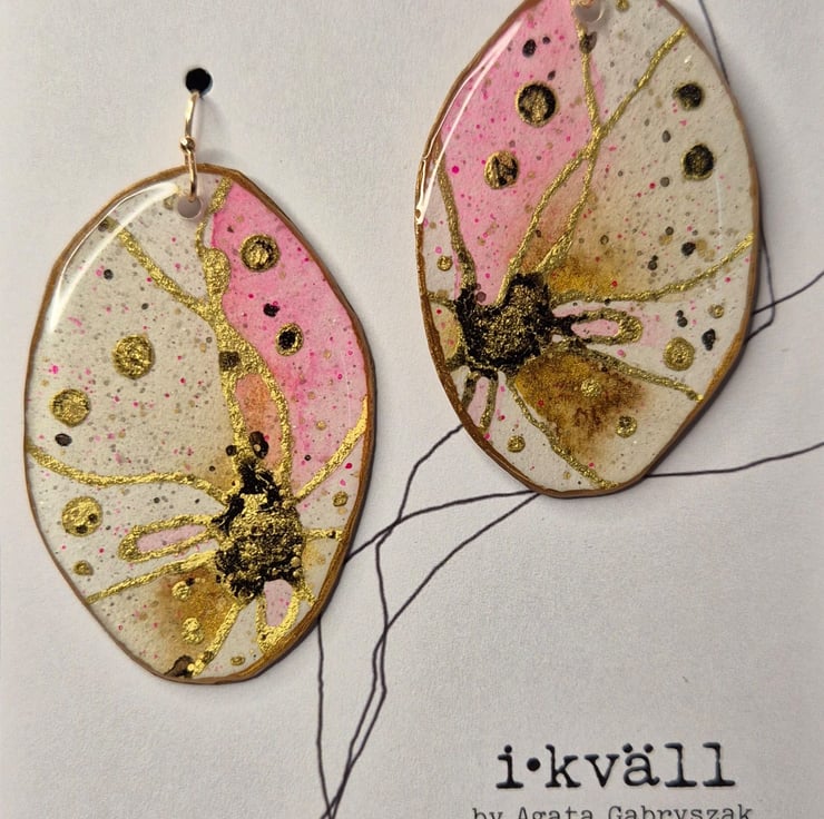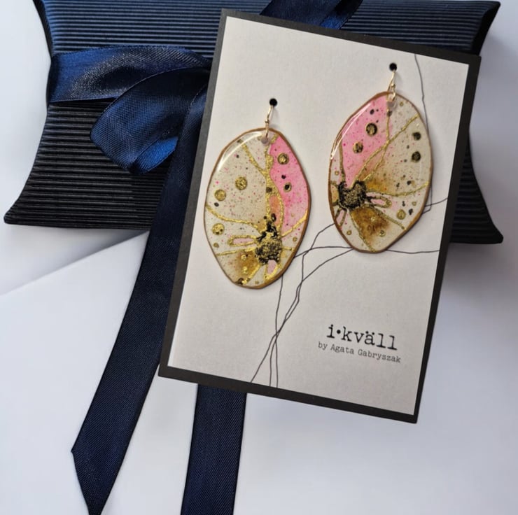 These beautiful large statement earrings are definitely made to impress. Unique mini watercolour paintings with inks, gold pigments and resin which gives them an almost 3D feeling. Extremely lightweight and elegant are ready to match any occasion.
