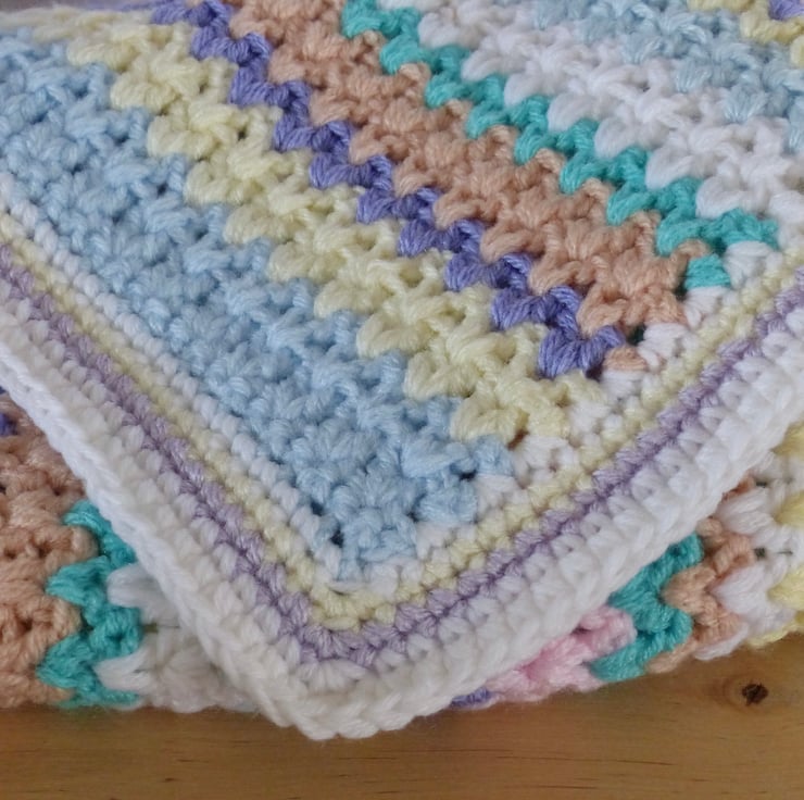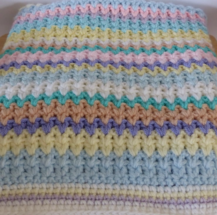 A crocheted blanket in lots of different pastel colours (about 11 in total). Crocheted using the classic 'V Stitch' it measures approximately 26" x 24" (68cm x 60cm) and has a border using colours within the blanket. This blanket is quite heavyweight as I have used most yarns in a double thickness. Ideal for use in a pram, pushchair, moses basket or car seat. A lovely gift for a new baby or for a Baby Shower Gift.