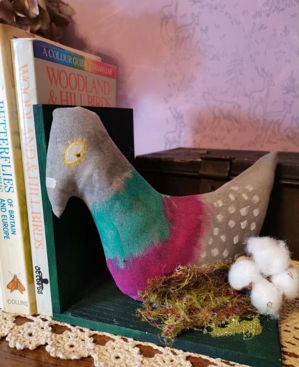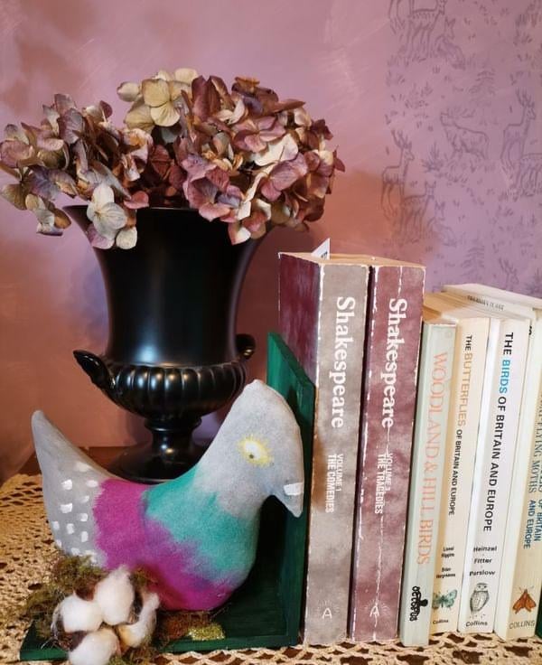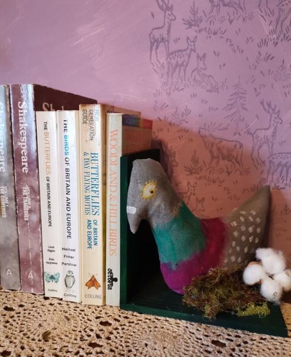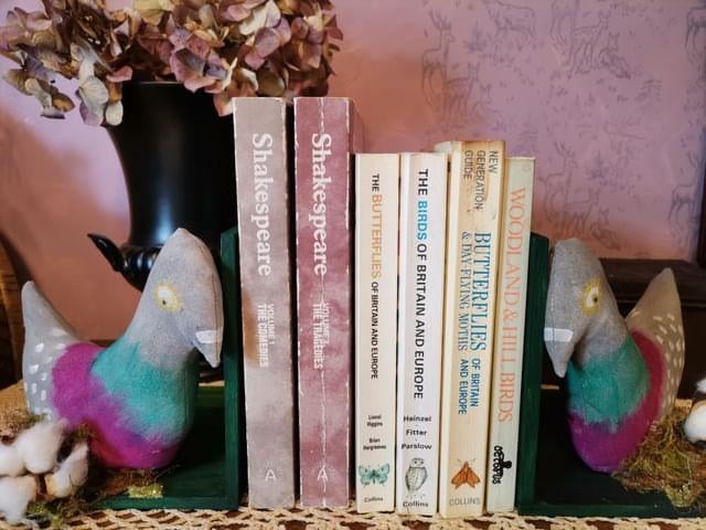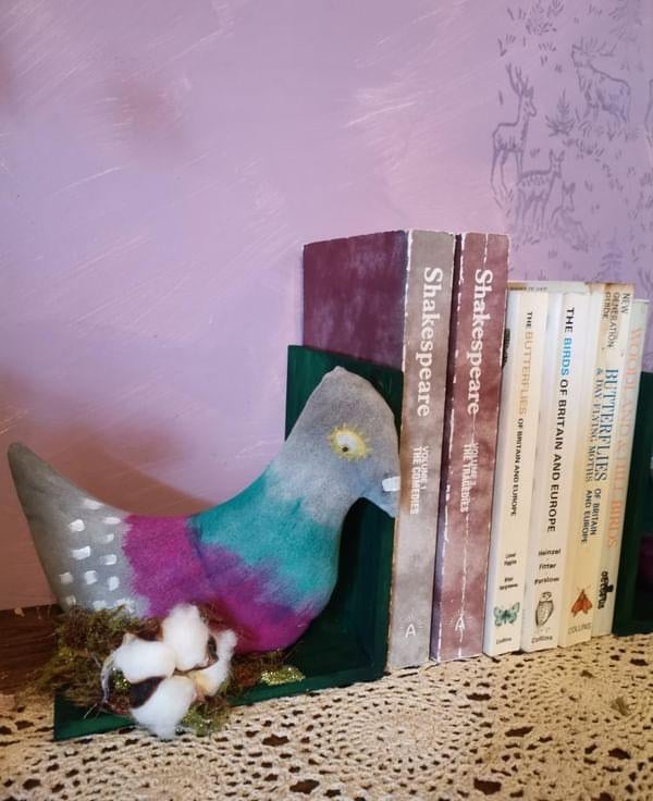 A pair of pigeon bookends, created on wooden bases which I then painted a deep, forest green.