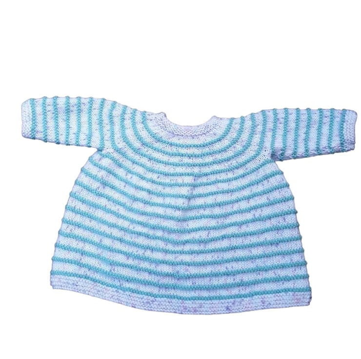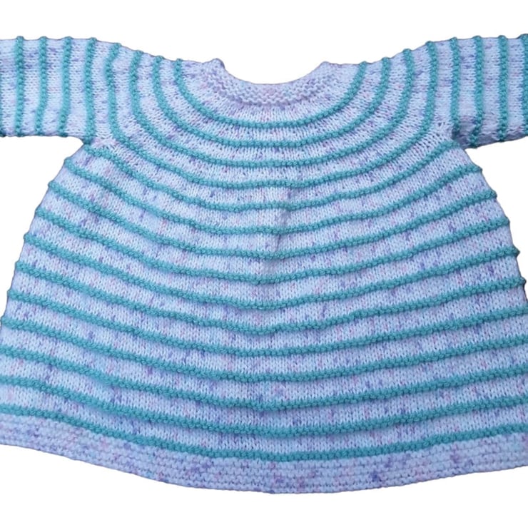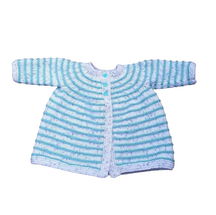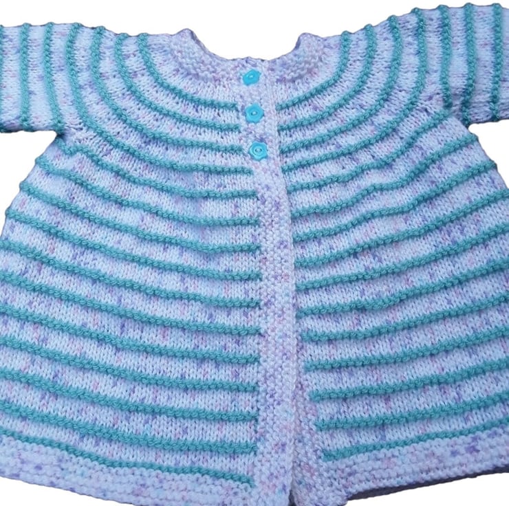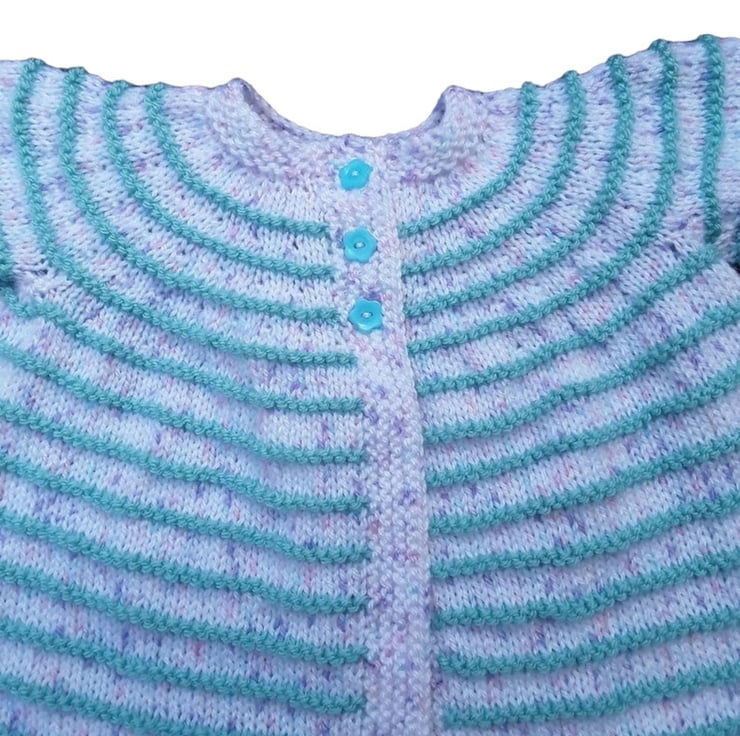 This adorable hand-knitted baby cardigan in white with cute raised spearmint green stripes is perfect for your little one, sized 0-3 months.
