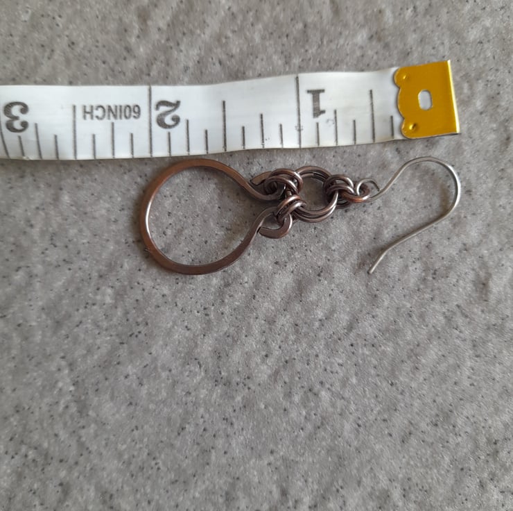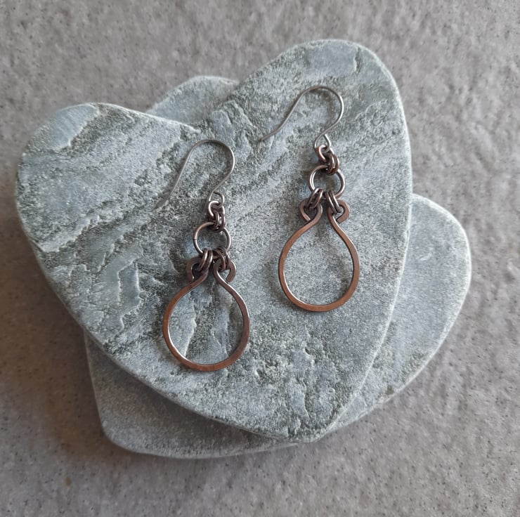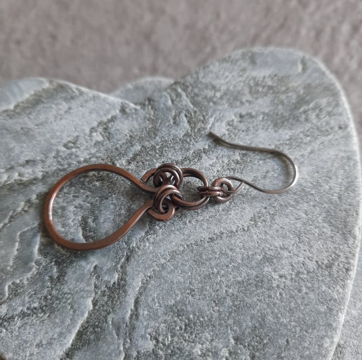 Handmade dangle earrings are made with oxidised copper wire and copper jump rings