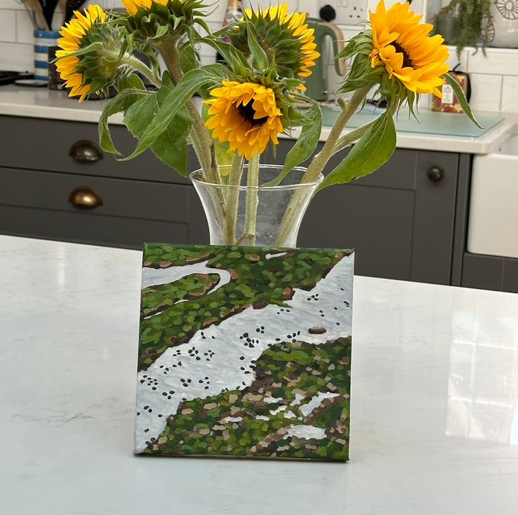 I’m experimenting a little with my style of painting as my hand pain and limitations make it challenging. This is one of my more abstract, spotty/spoldgy styles, it allows me to express my love of the British coastline without causing too much discomfort.