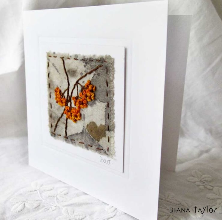 This beautiful card has been embroidered by hand onto eco printed fabric. The fabric has been hand-dyed and the embroidery design is of branches with golden autumn berries, sewn in shades of golden yellow colours with a few tiny glass seed beads added - perfect for a special card, or perhaps framing it as it is. It has been mounted on a card base and is surrounded by an embossed square. The card has been left blank for your own message.
