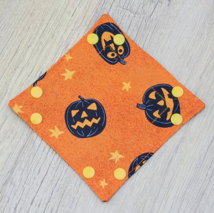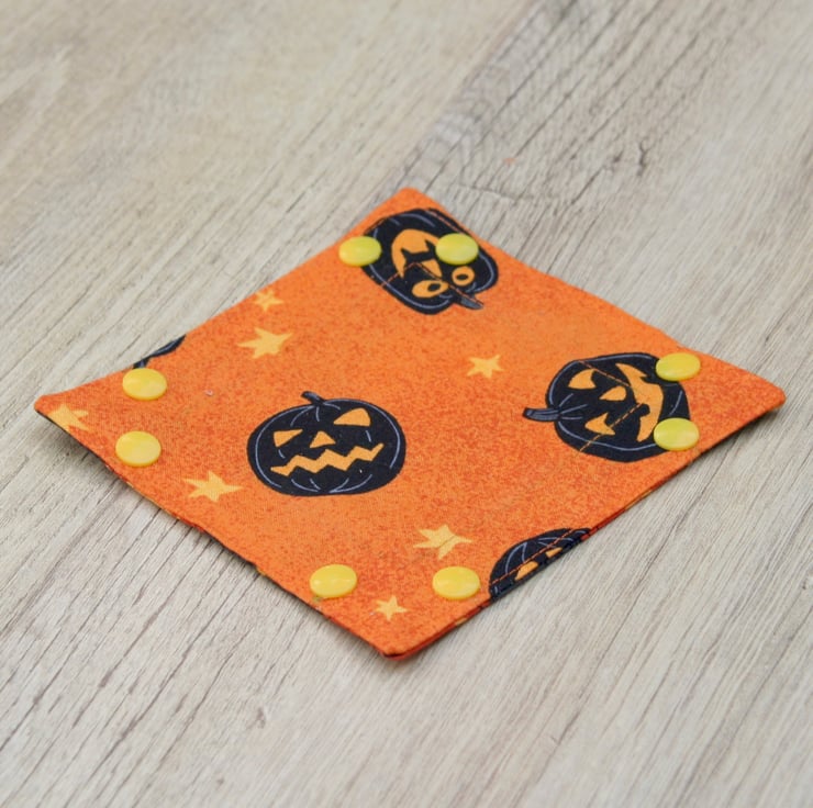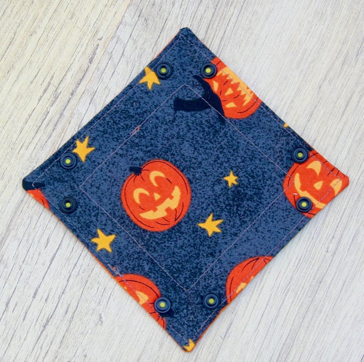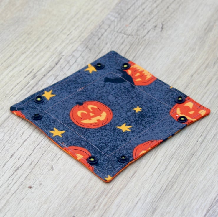 It is made using high quality cotton in dark grey and orange with some fun pumpkins. There are four plastic snap fasteners holding the box closed so you can store the box flat when not in use.