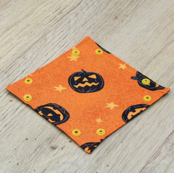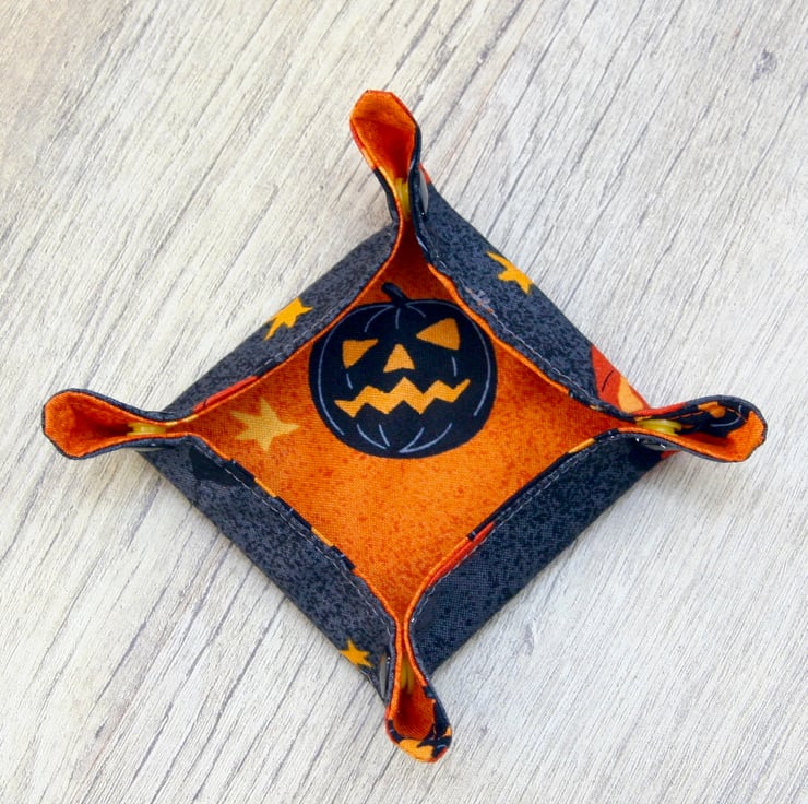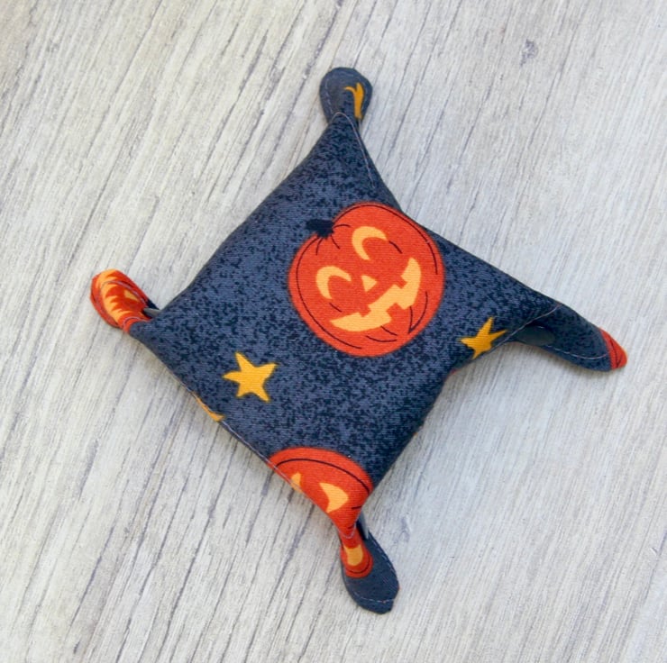 It is made using high quality cotton in orange and dark grey with some fun pumpkins and scattered stars. There are four plastic snap fasteners holding the box closed so you can store the box flat when not in use.