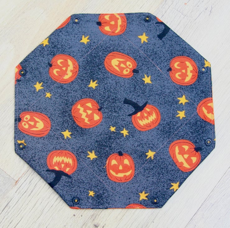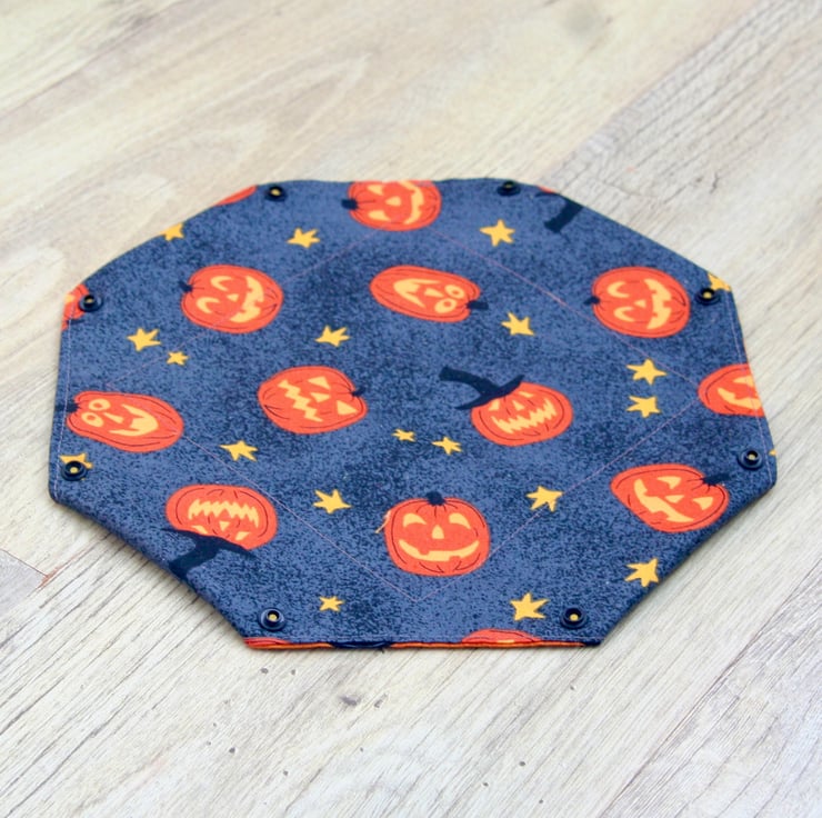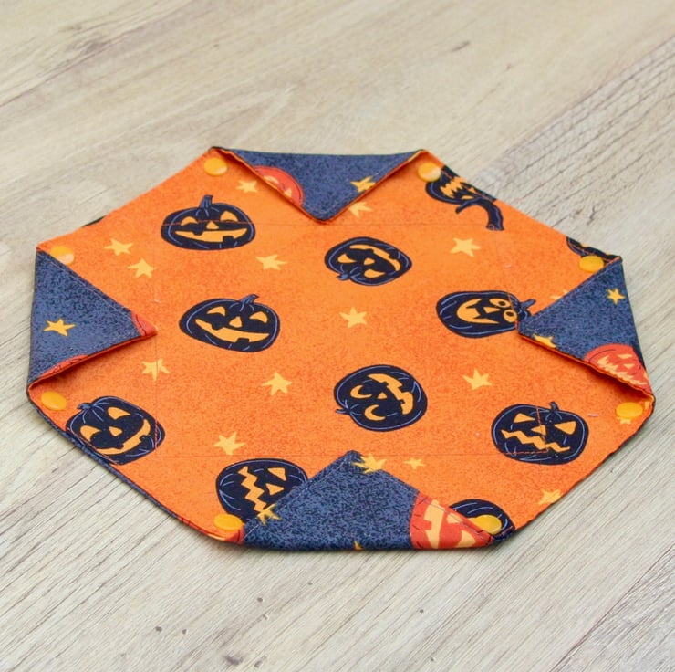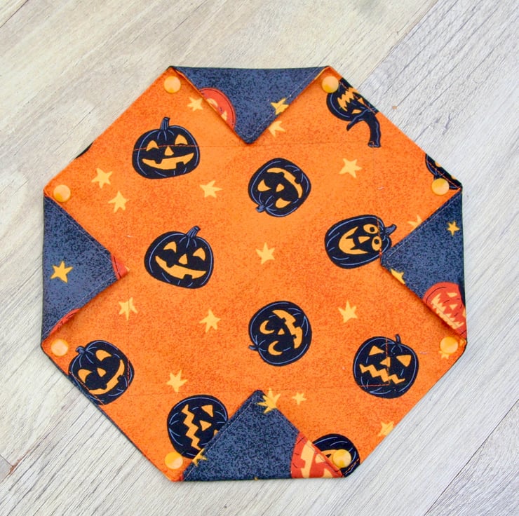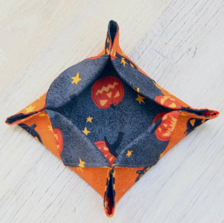 It has been made using a orange and dark grey fabric with scattered pumpkins and stars. There are plastic snap fasteners on the corners of the box so it can be laid flat when not in use.