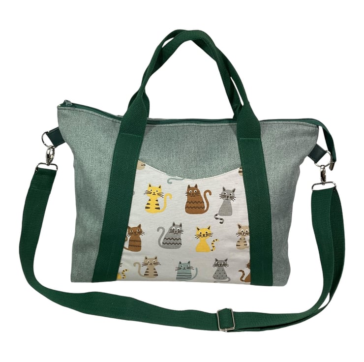Externally is a feature pocket in cat print canvas that has a magnetic snap closure. 2 webbing handles and a fully removable and adjustable strap complete the design.