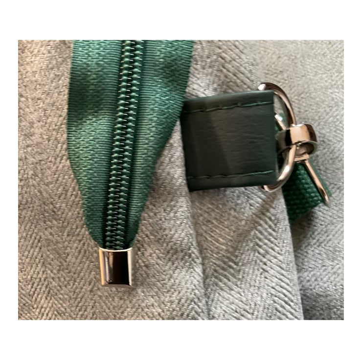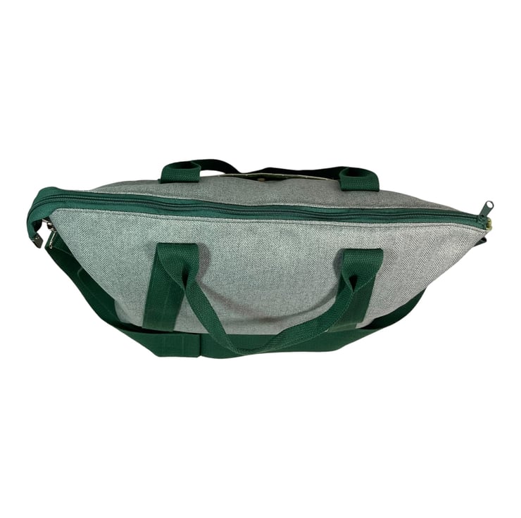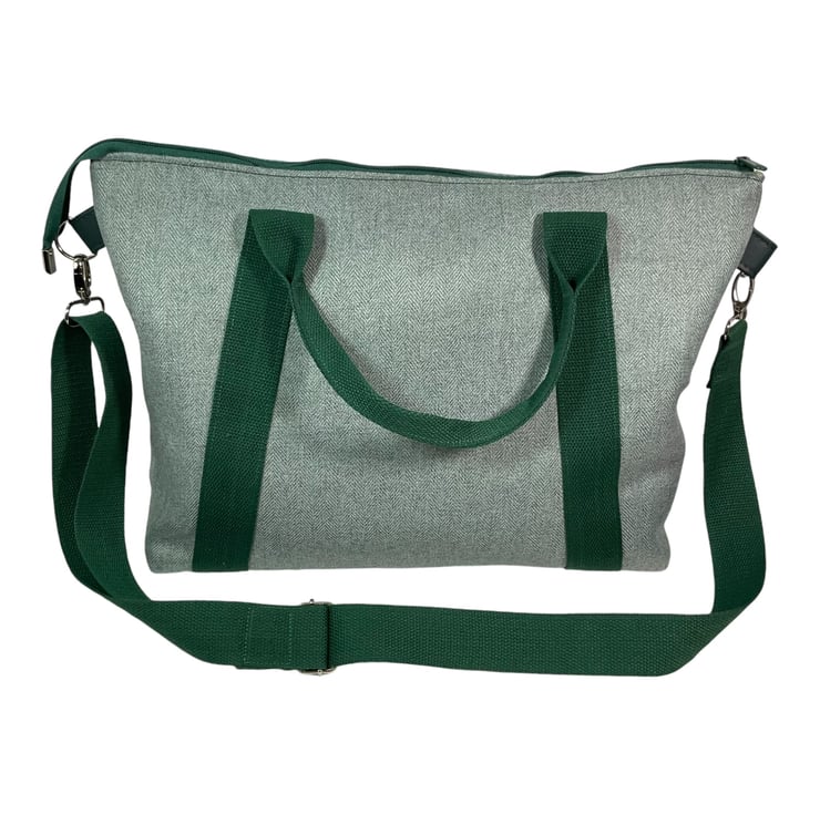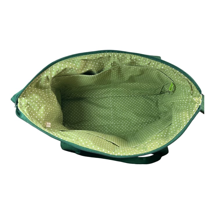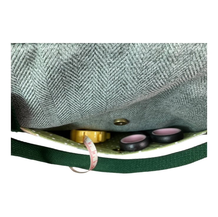 The outer is in a light sage green herringbone design fabric and the lining is sage green with white polka dots fabric.