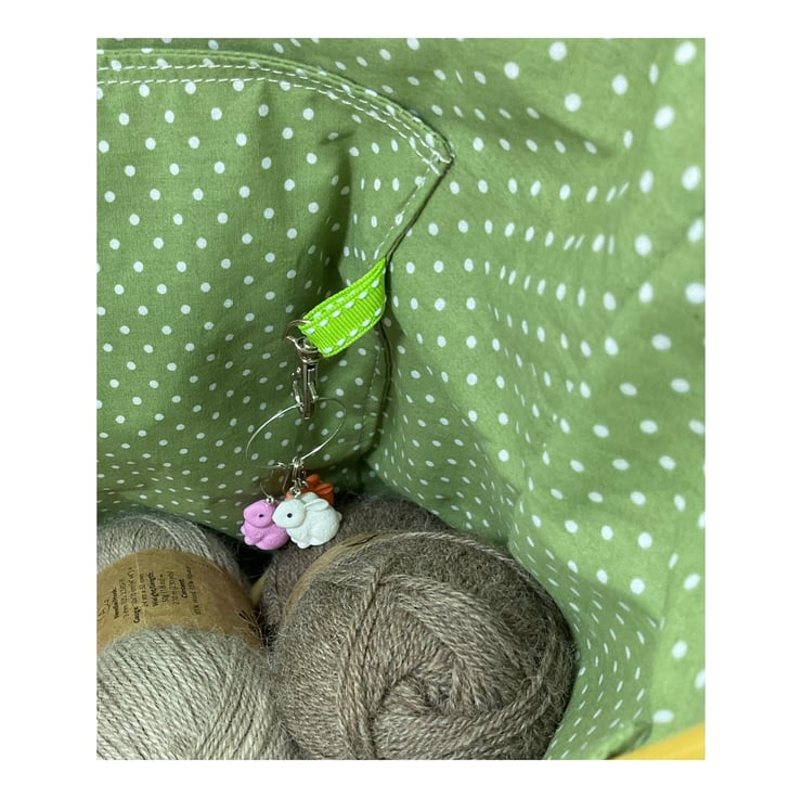 The ultimate knitting bag, this bag has lots of pockets and slots for your needles - 2 for straight needles up to 10”, 1 for crochet hooks, 1 for DPN needles up to 8”, 1 for circular and a further 3 larger pockets for patterns, books, phone etc. Also included is a lobster clasp for your stitch markers, keys or used as a yarn guide ( shown in an alternative print bag)