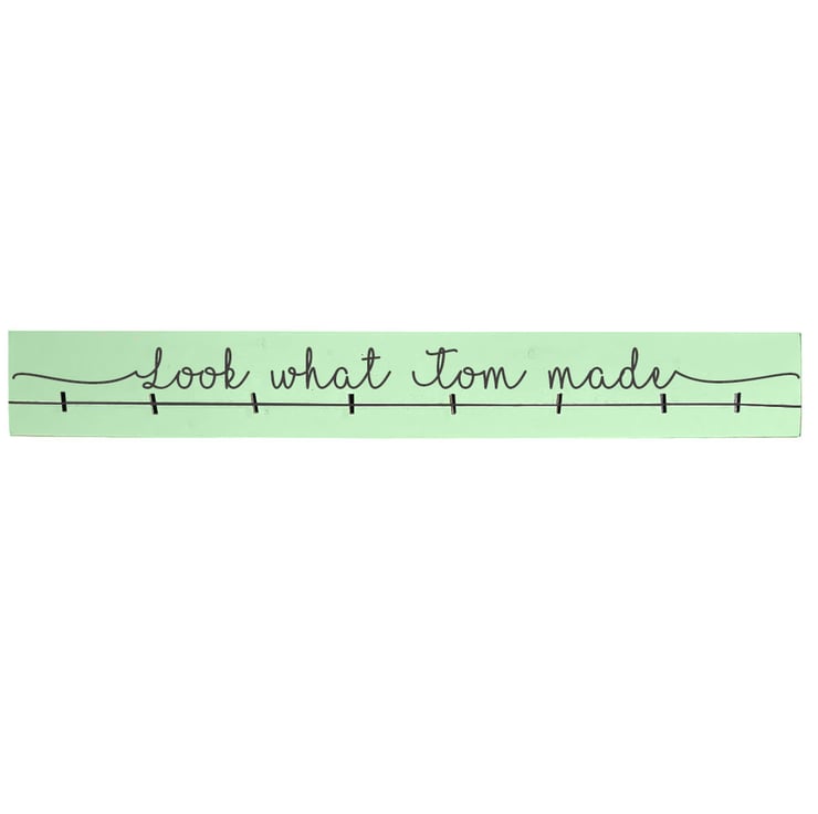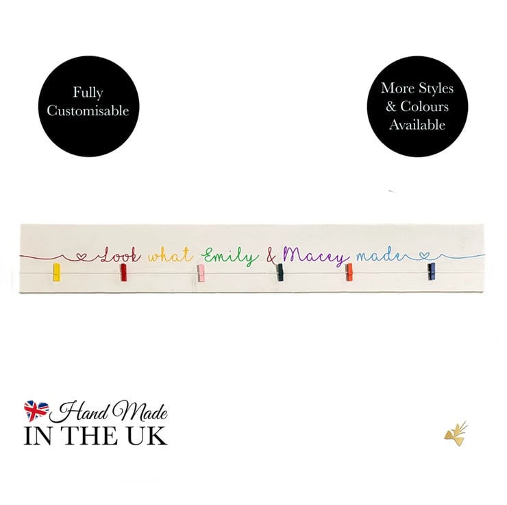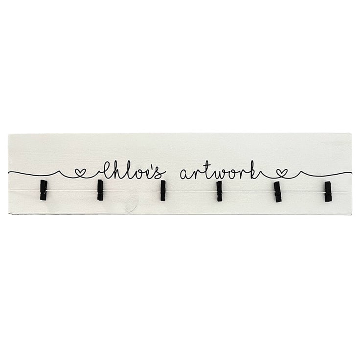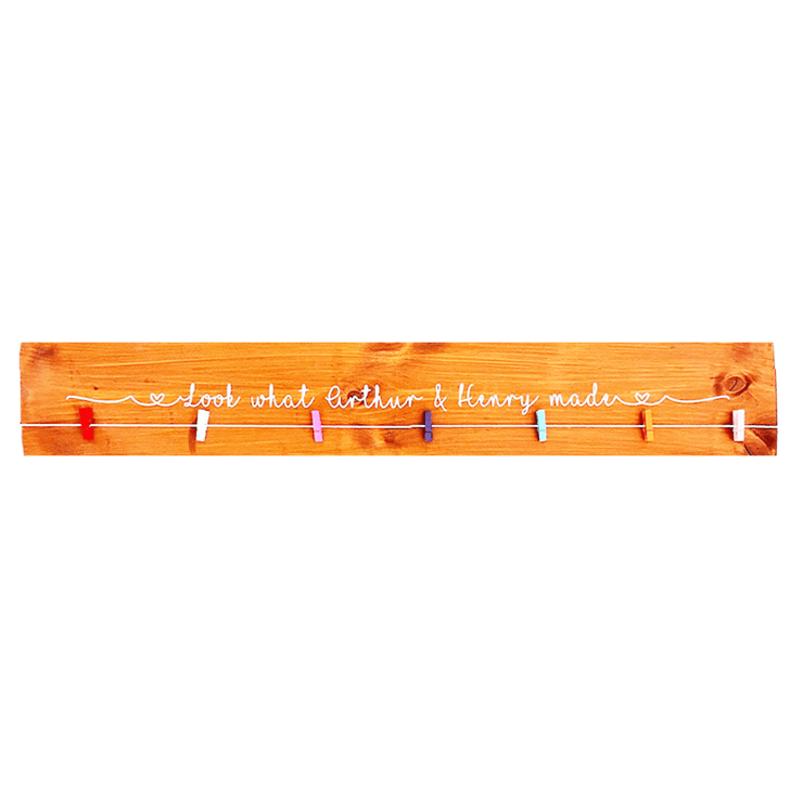 Featuring colourful pegs and string, it's a perfect way to showcase your little one's masterpieces in any room. Each piece is thoughtfully crafted from locally sourced, repurposed wood, hand-cut, and personalised just for you. The plaque is finished with permanent vinyl lettering and sealed with a non-toxic coating for lasting quality.