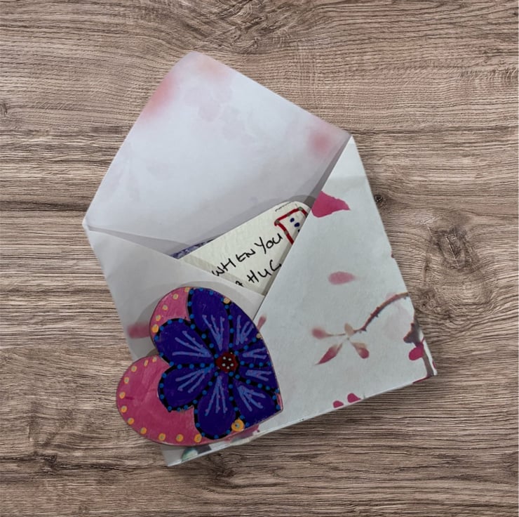 Small hand painted heart pocket hug with a hand folded envelope and hand painted message card ‘For when you need a hug and I am not there to give it to you x’