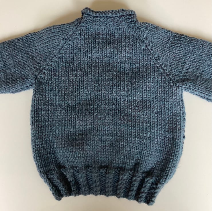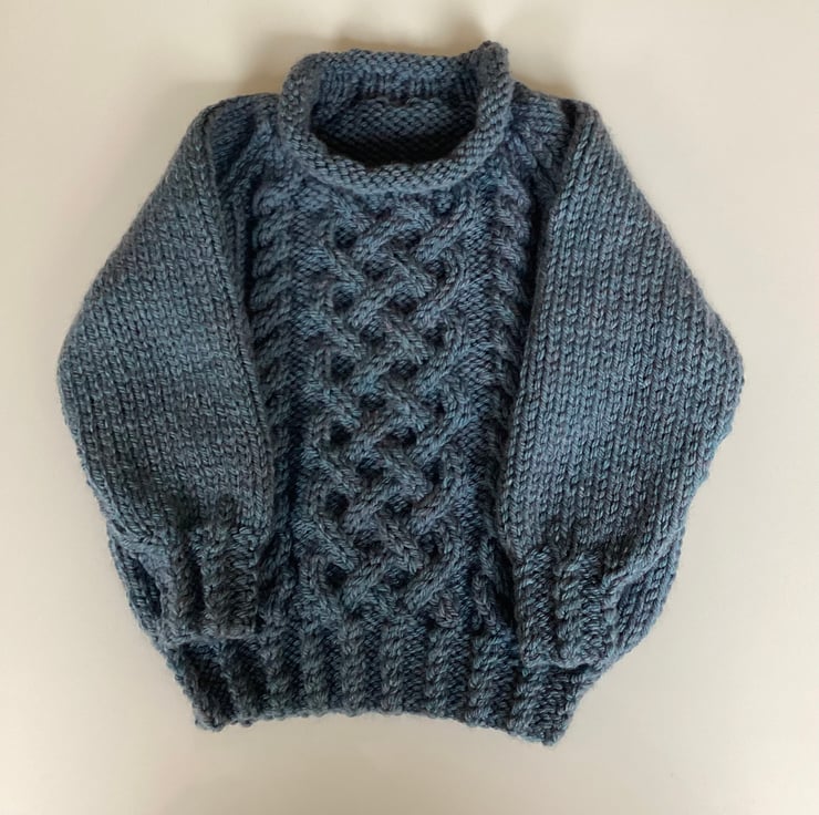 Gorgeous warm jumper hand knitted by me in my Suffolk home. I have used one of my favourite vintage patterns to knit this little jumper in a good quality, very soft, merino mix chunky yarn in a stunning denim blue colour. The twisted rib and roll over neck add interest to this very comfortable to wear cable knit sweater. Knitted to fit a little one of approximately 12-18 months, but please use these actual garment measurements to be sure of the size.
