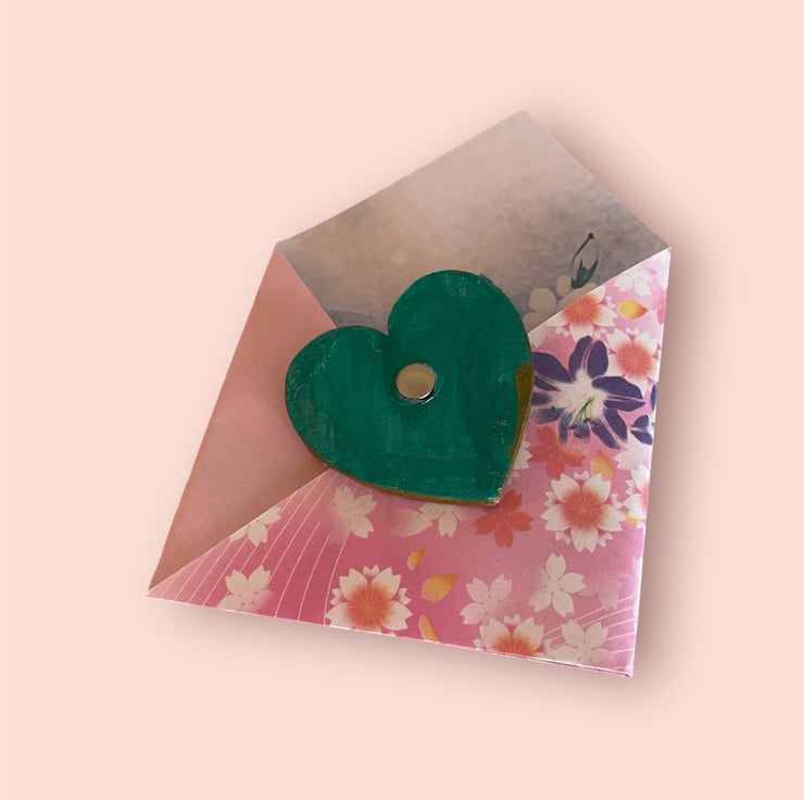 Small hand painted heart fridge or white board magnet with a hand folded envelope.
