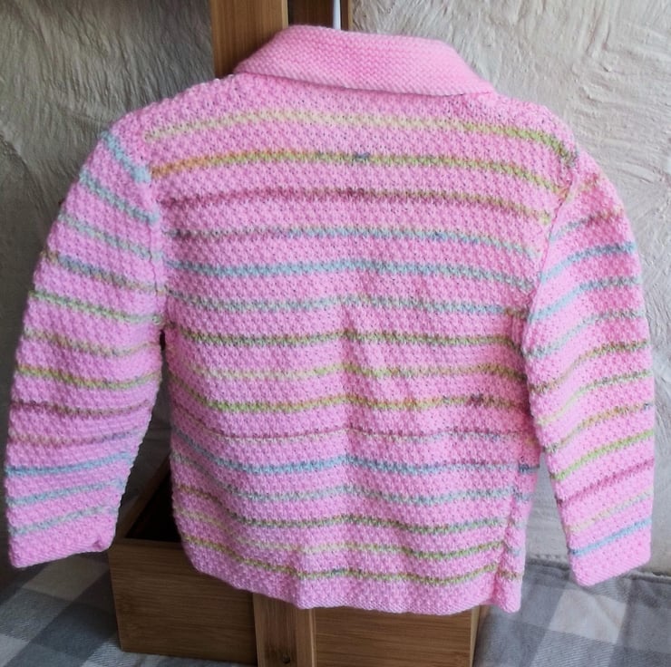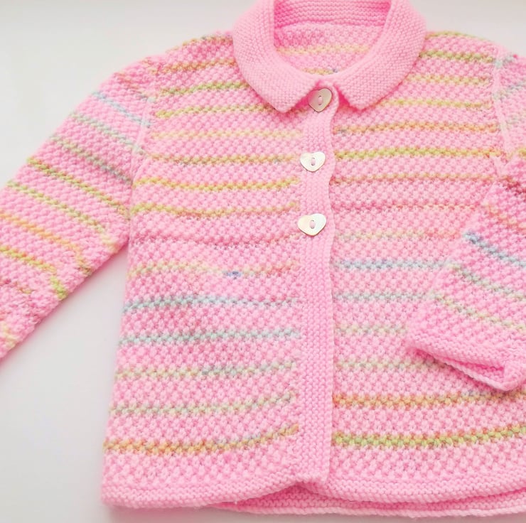 Hand knitted by me. Pink and Pastel stripes Babies Cardigan Jacket. Collared neck with garter stitch cuffs and 3 shell buttons closure. Knitted in fine weight acrylic blend yarn. hm46