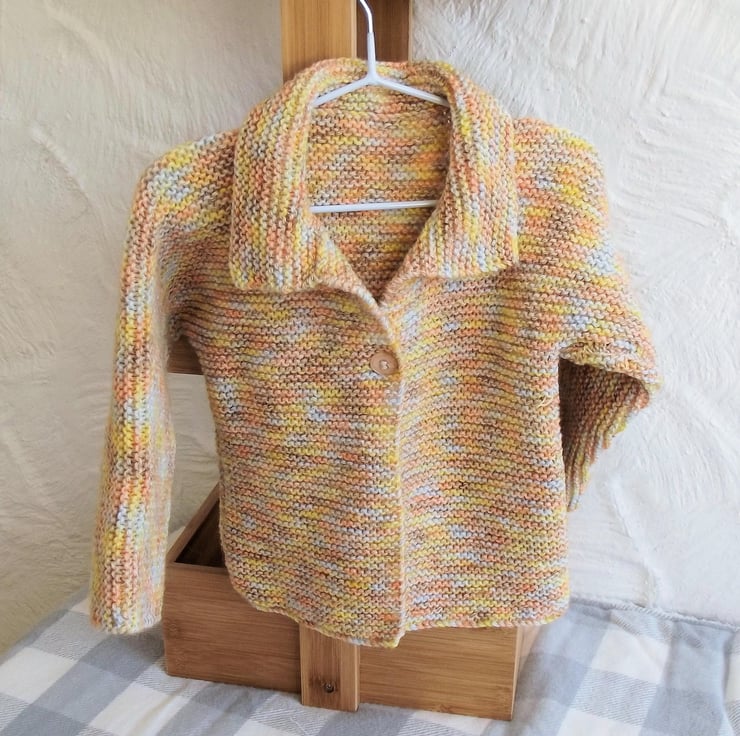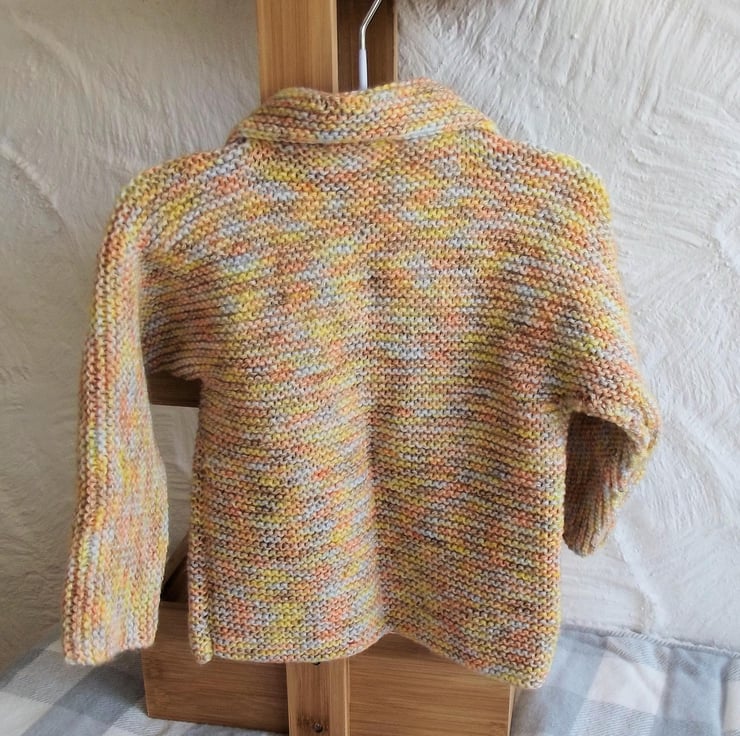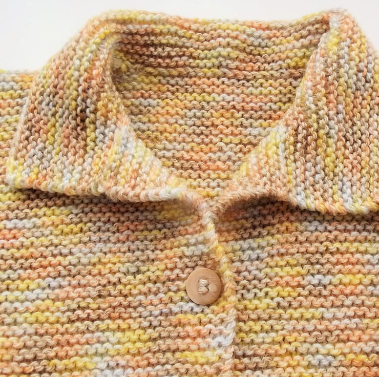 Hand knitted by me. Yellow, beige and Peach Babies Cardigan Jacket. Collared neck with 1 button closure. Knitted in medium weight acrylic blend yarn. hm44