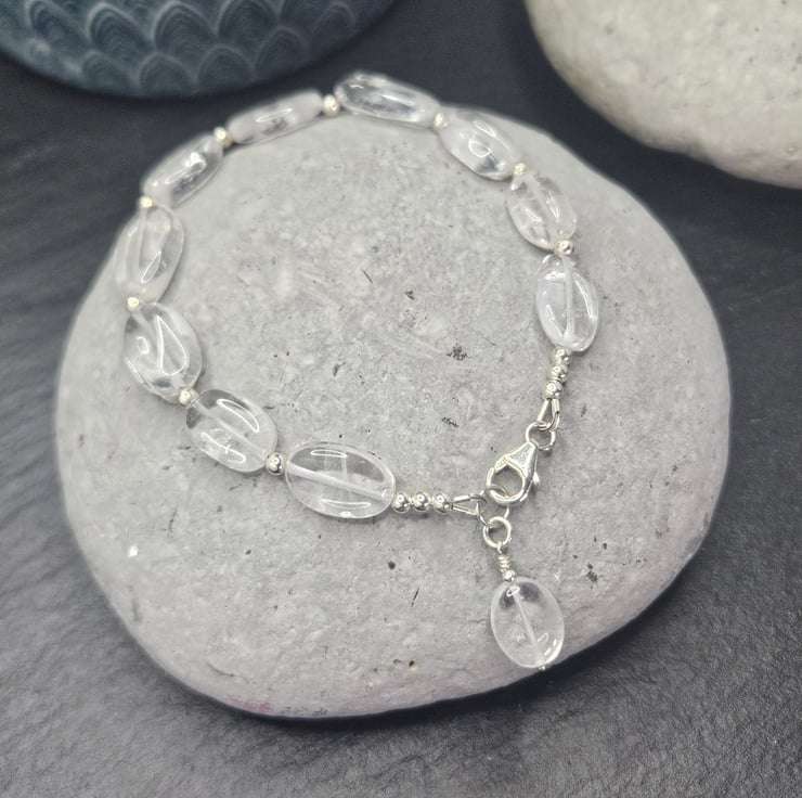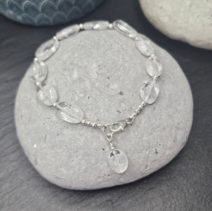 This pretty bracelet is made with clear crystal quartz nugget-shaped beads and is interspaced with sterling silver round beads. It features an accent crystal quartz bead as a signature charm next to the clasp. The bracelet fastens with a sterling silver carabiner clasp and is threaded on strong and flexible 49-strand jewellery wire. All the metal components of the bracelet are sterling silver.