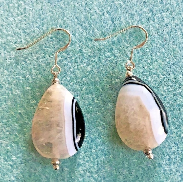 Tear Drop shaped Agate & Quartz Dangle Earrings with Sterling Silver Shepherd Hooks