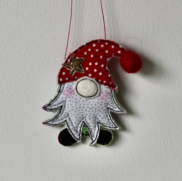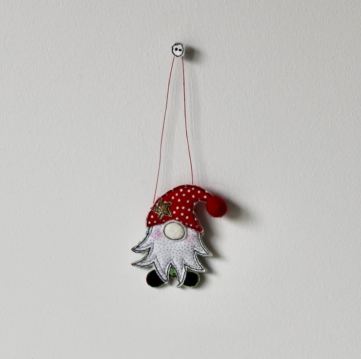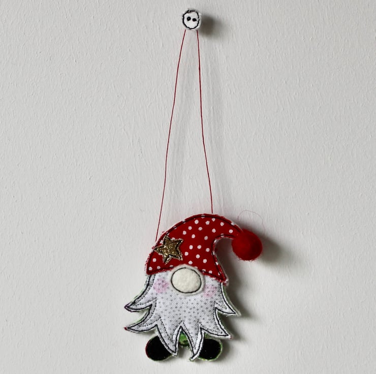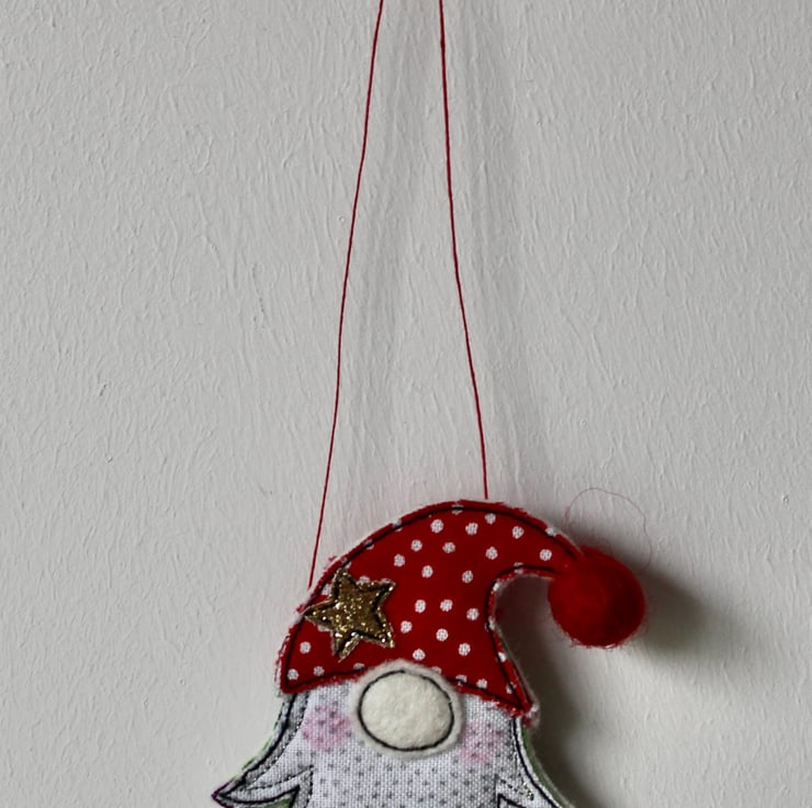 A delightful hanging decoration which is created using multiple layers of 100% wool felt, cotton cloth, glitter fabric, a handmade wool felt ball and free hand machine embroidery. It is cut out by hand using a very sharp pair of scissors.