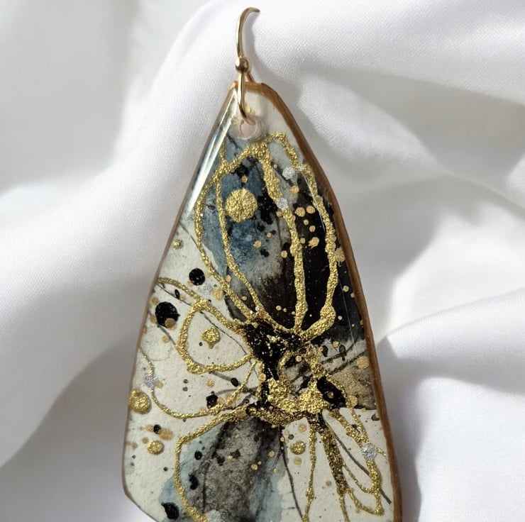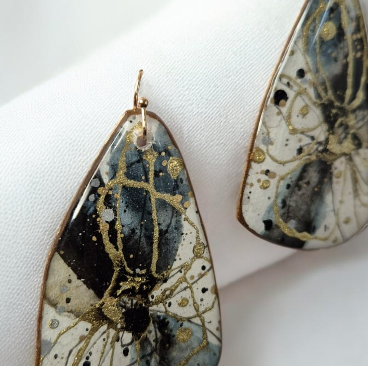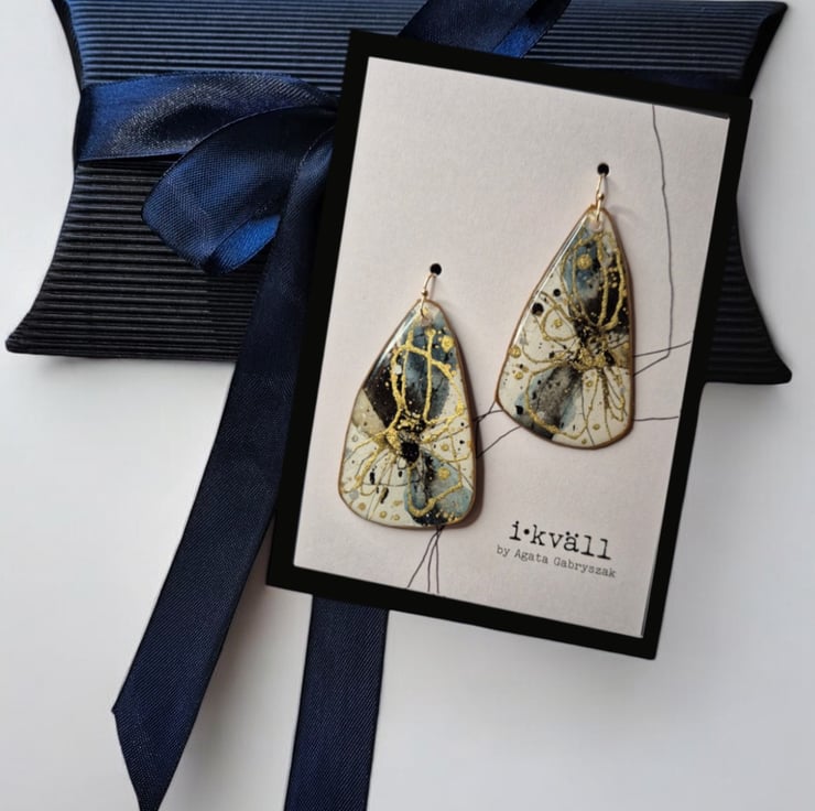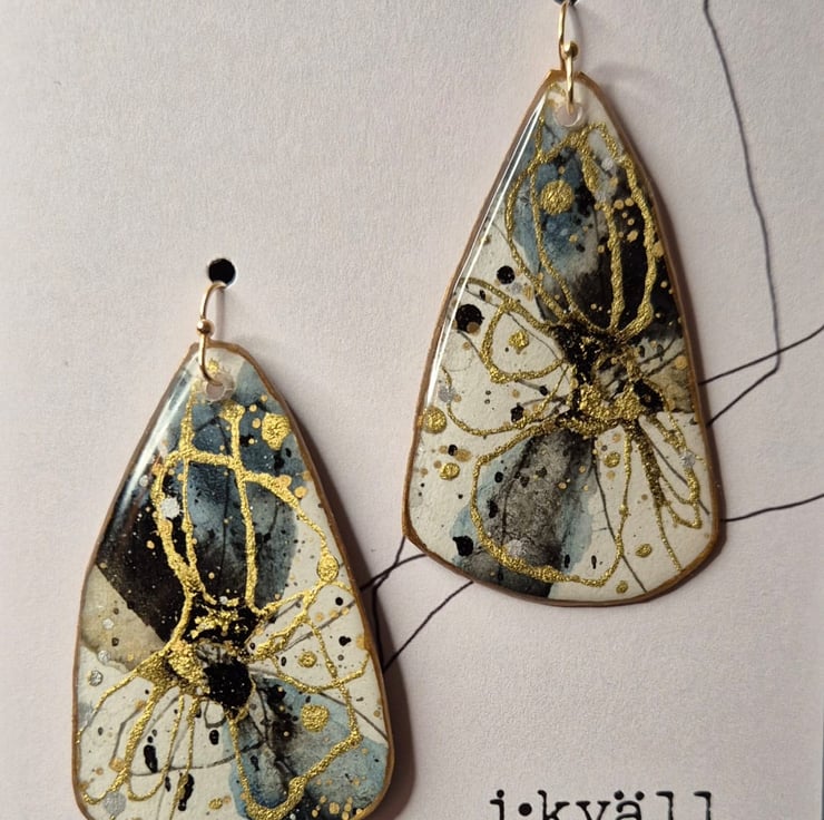 These beautiful large statement earrings are definitely made to impress. Unique mini watercolour paintings with inks, gold pigments and resin which gives them an almost 3D feeling. Extremely lightweight and elegant are ready to match any occasion.