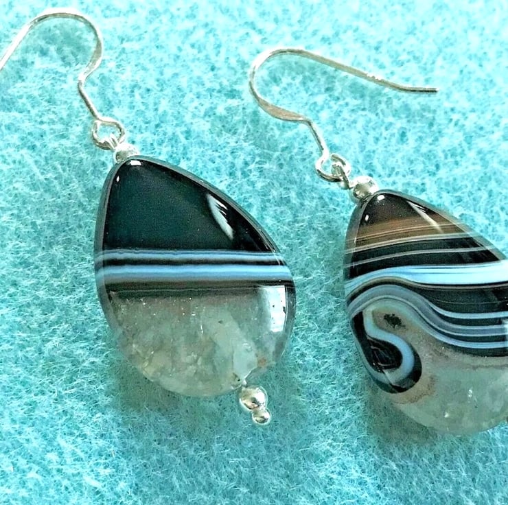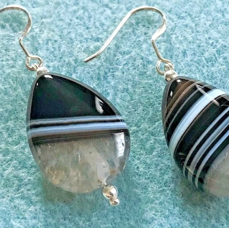 Created using Quality 9.25 Sterling Silver Shepherd Hooks and Drop shaped Black & White Striped Agate with Clear Crystal Quartz